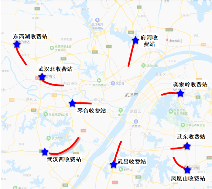 ◆需经关豹高速武东收费站出城的车辆,可考虑经武汉绕城高速的凤凰山收费站、光谷二路绕行;