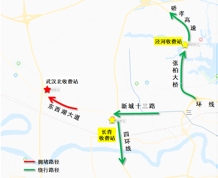 ◆需经武汉北收费站出城的车辆,可考虑通过二环线长丰大道高架行至径河收费站绕行硚孝高速或经东西湖大道、新城十三路行至长青收费站绕行四环线。