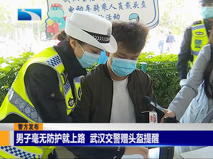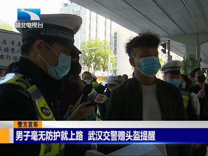 男子毫无防护就上路 武汉交警赠头盔提醒