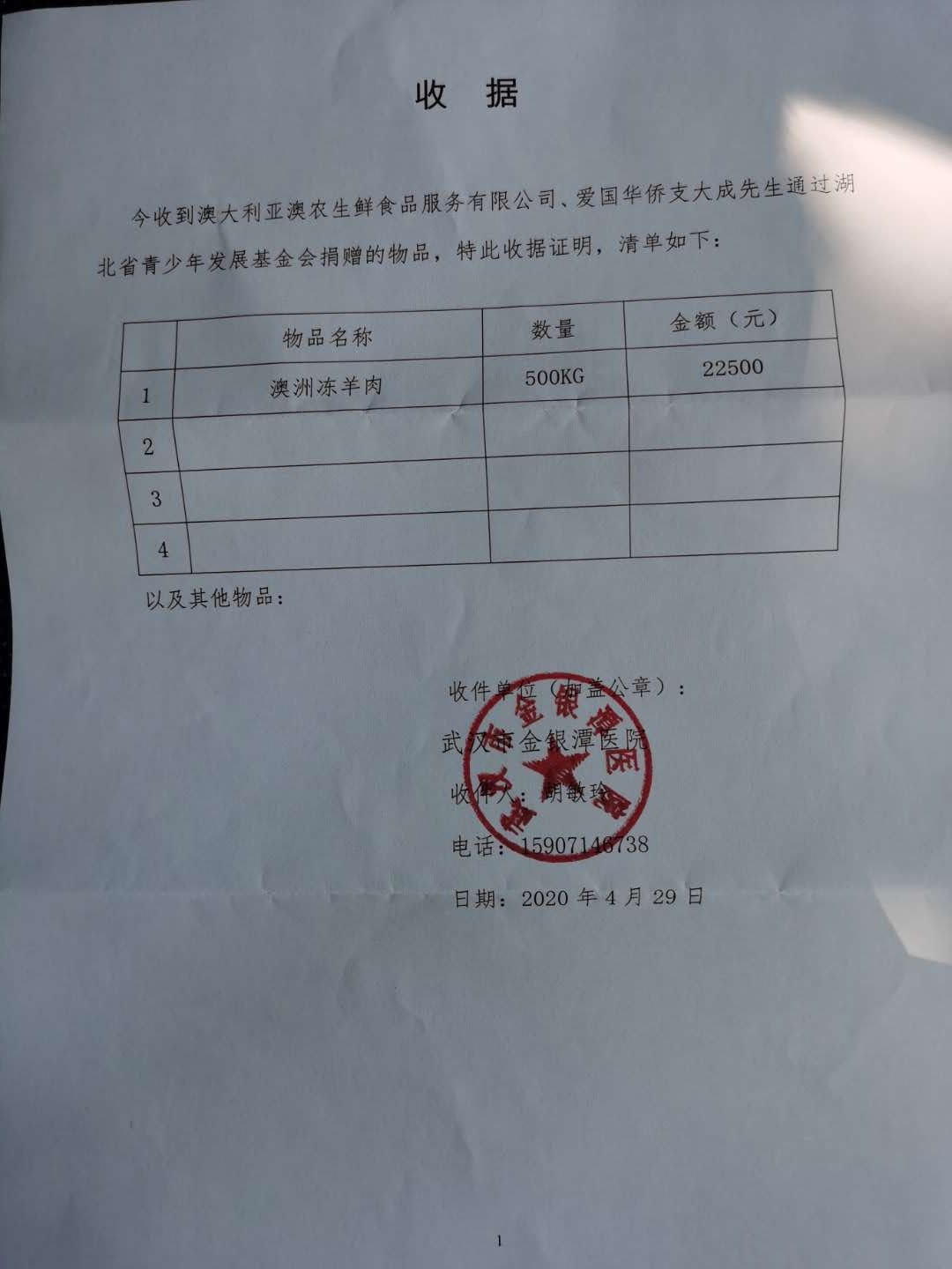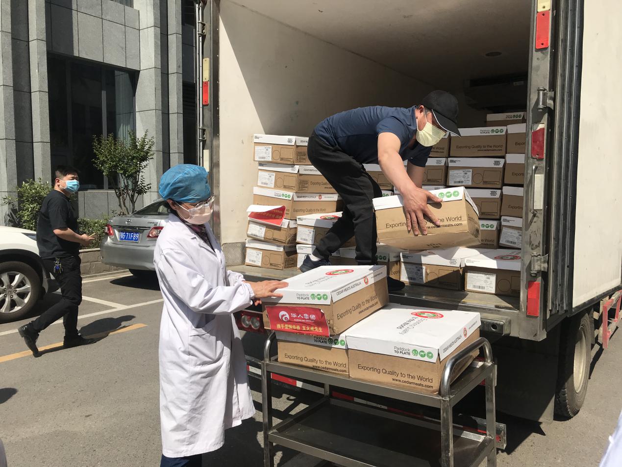 4月29日,华人集团联合澳农生鲜CEO支大成向武汉市金银潭医院捐赠500公斤澳洲羊肉,慰问抗击疫情的一线医务工作者。