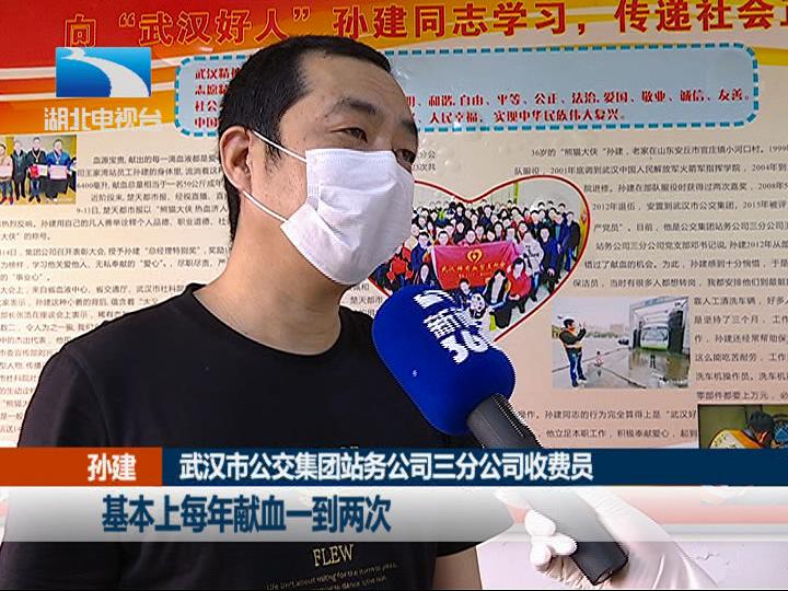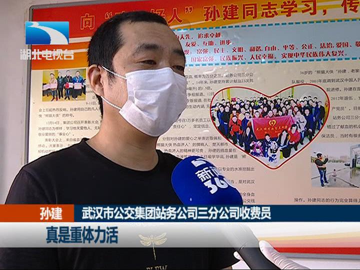 武汉市公交集团站务公司三分公司收费员 孙建:基本上每年献血一到两次,累计加起来有10000毫升出头,相当于两个成人全身的血量。
