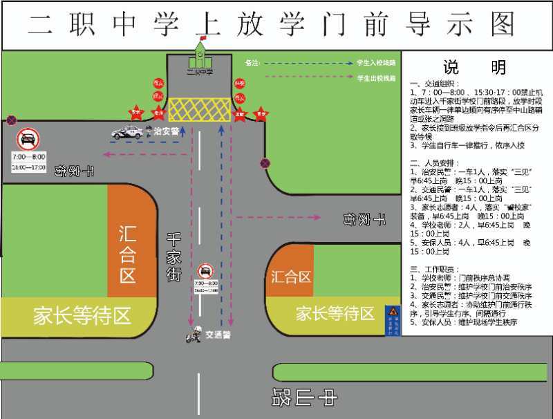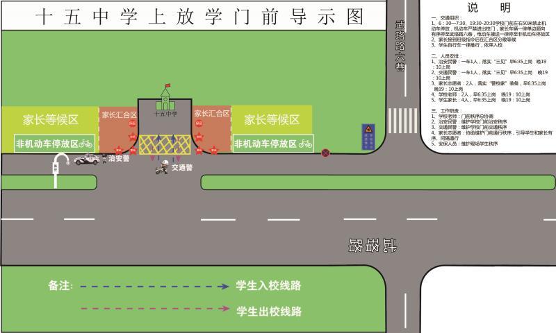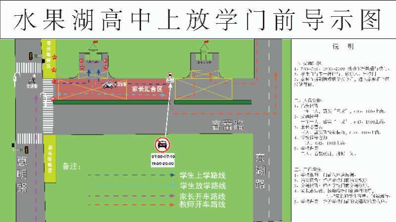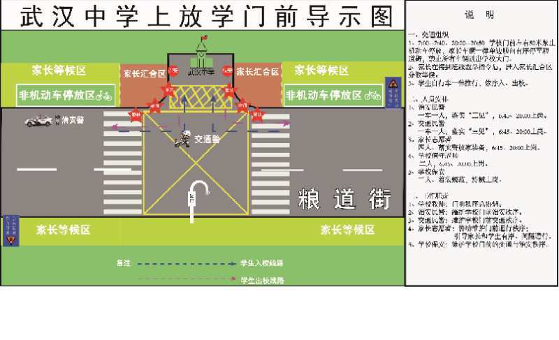 针对易发生交通拥堵的校园周边道路,防止放学时段人员聚集,武昌区交通大队发布交通“导示图”,在学校周边分别设置“家长等候区”、“家长汇合区”两个接送区域,希望学生家长严格按照现场管制要求,服从交警指挥,按时接送学生。