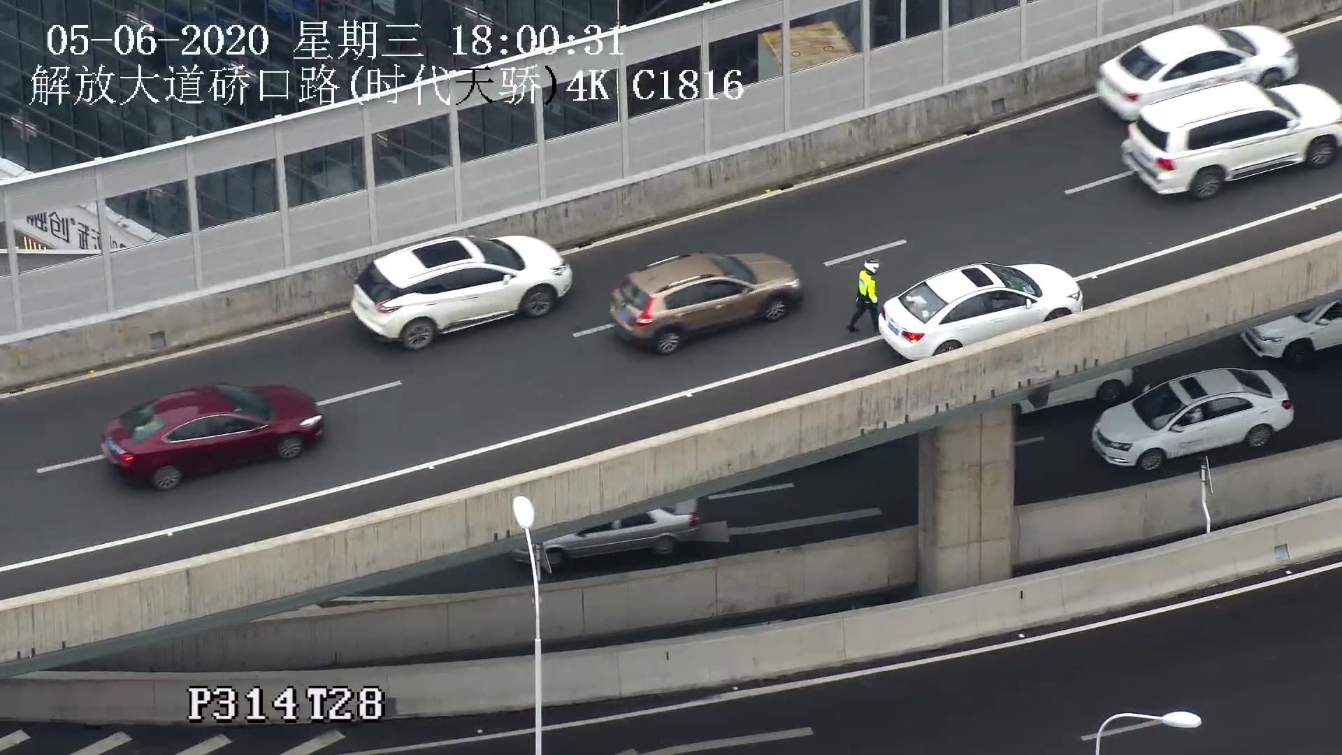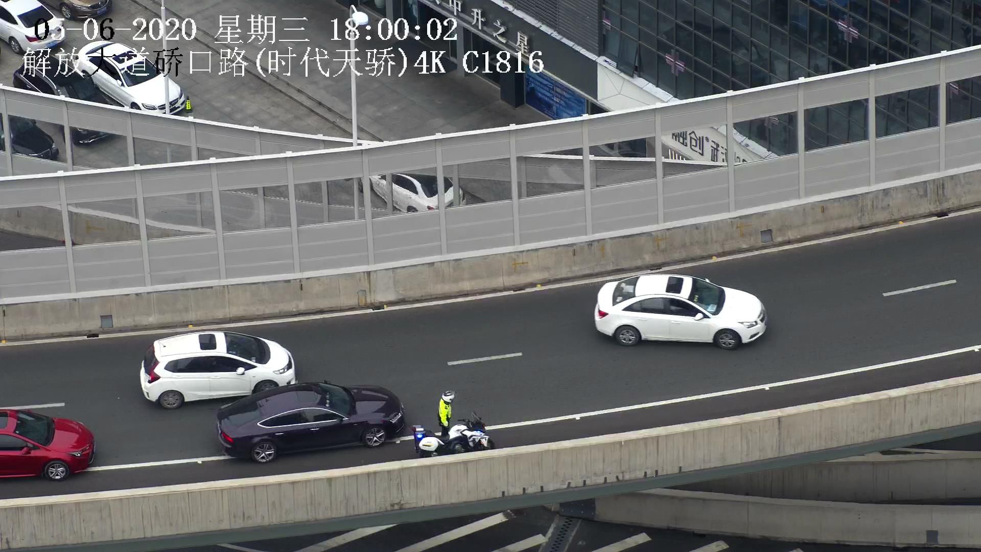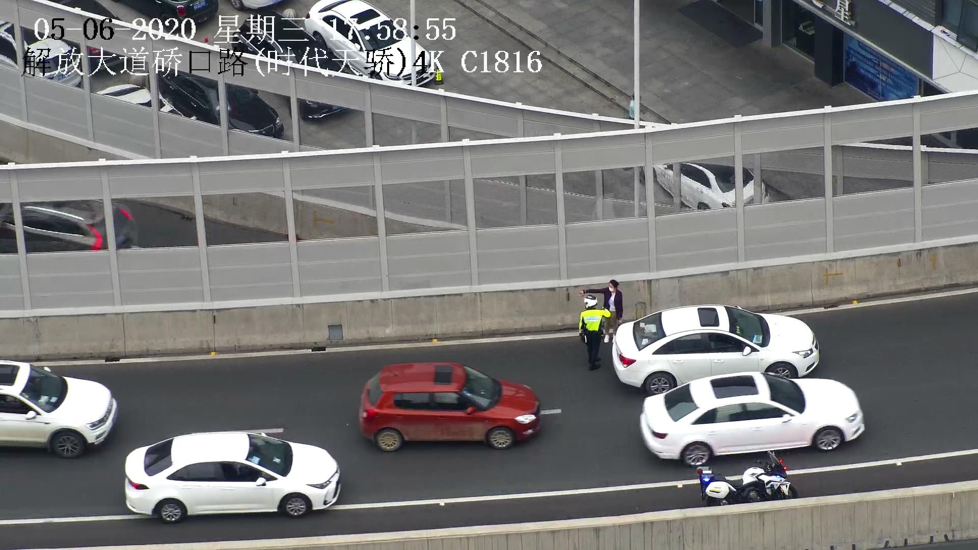 5月6日是假期后上班的第一天,也是高三开学首日,晚高峰时间车流量很大,解放大道航空路口,硚口交通大队5名民警在紧张的疏导交通。17:50分许,上宝丰高架桥方向突然出现滞留,车辆排队的尾巴很快就影响到航空路转盘,大队指挥中心的值班员随即传来信息,在连接月湖桥的匝道上,一辆小车停在路中间,这就是堵塞的原因,汉警快骑队员杨鸿博立刻骑上摩托车赶到现场。