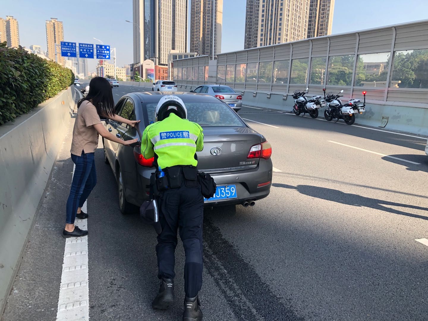 当日上午8时许,东湖高新区交通大队一中队汉警快骑队员廖桥、陈俊、邓劲松三人巡逻至杨家湾附近时,接到大队指挥中心派警:在雄楚大道高架杨家湾路段东向西方向,有一辆疑似故障车停在路中,造成拥堵。三人立即赶到了事发地点处置,只见一辆发动机冒烟的私家车停在快车道上,驾驶员一脸焦急地坐在车上。