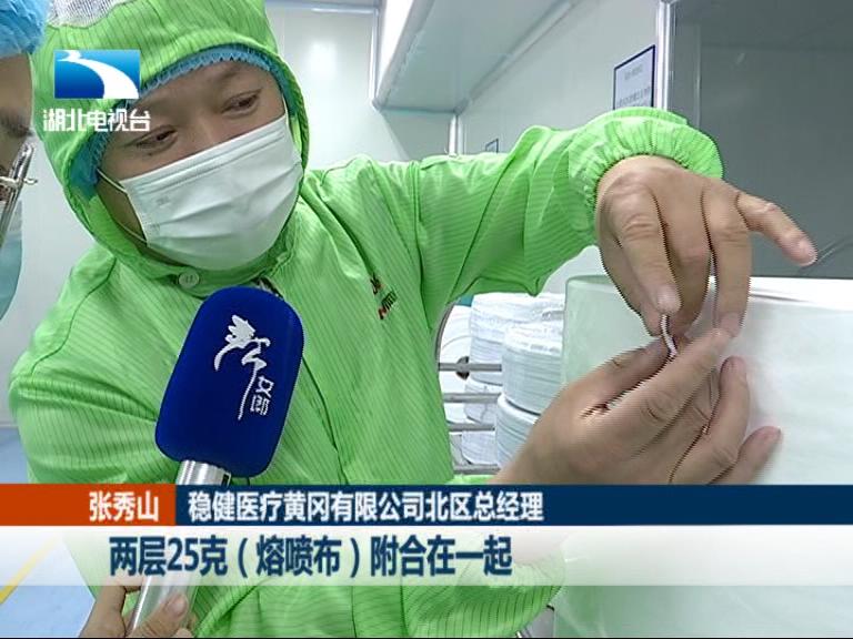 稳健医疗黄冈有限公司北区总经理 张秀山:现在使用的是这个高标过滤布是50克,然后BFE(细菌过滤效果)要大于等于95%。两层25克熔喷布附合在一起,两层附合在一起可以起到防护作用。