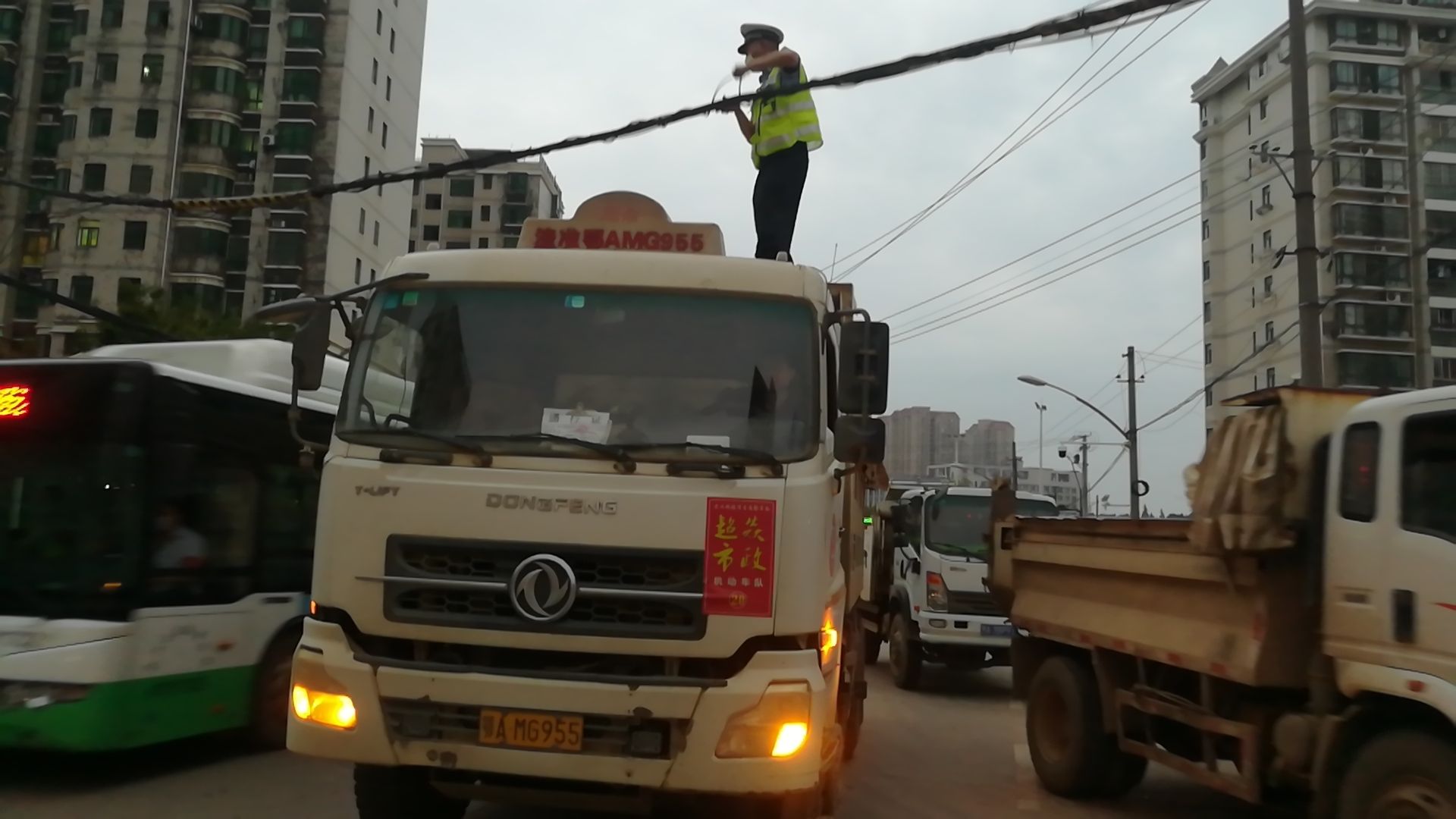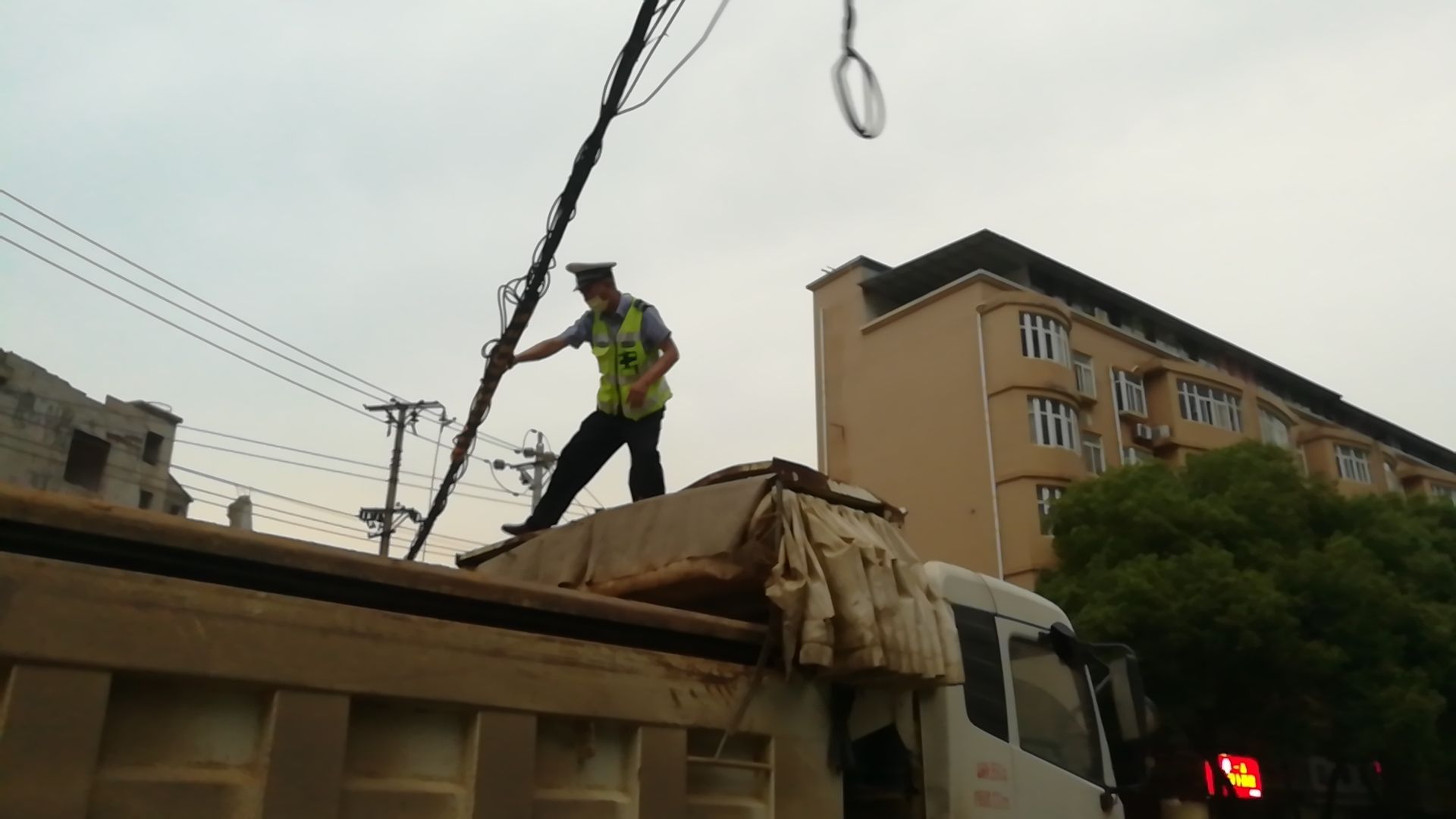 正值晚高峰时段,车流人流量较大,脱落的电缆线给过往车辆及行人带来极大的不便和交通安全隐患,如果不及时处置,极有可能导致该路段交通瘫痪。事不宜迟,付俊秋立即采取措施,一边通过随身电台向指挥室汇报情况,通知相关管线部门派人前来,一边借用就近工地的一台自卸式货车,在确认缆线有绝缘外层没有触电危险的情况下,与赶来增援的同事徐志一起爬上车顶,小心地将垂落的电缆线挑起重新缠绕。