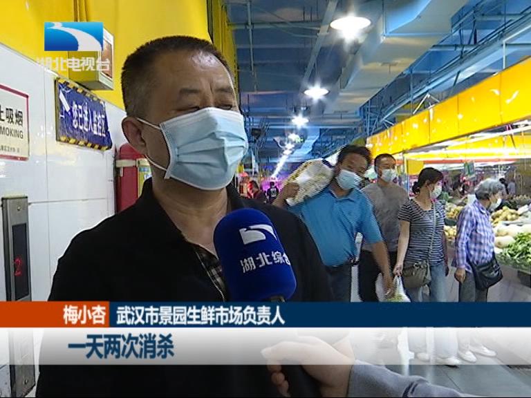 武汉市景园生鲜市场负责人 梅小杏:一天两次消杀,商户以前有157户,现在按照100户以内进行控制。经营户和经营户之间,必须要达到两米以上间距。以前一家经营户有两个人三个人,我们现在只让一个人经营,市场内五到六名工作人员疏导顾客。