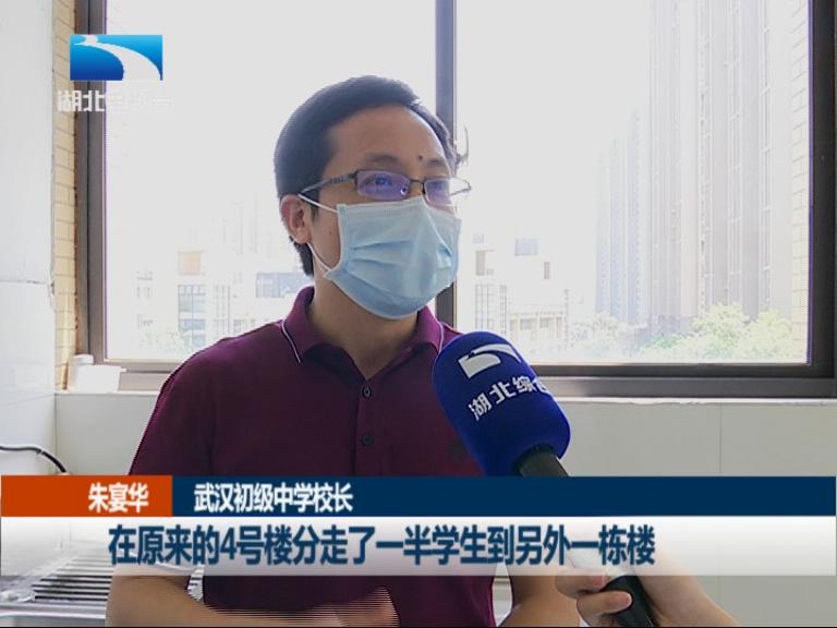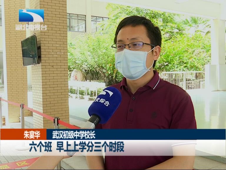 武汉初级中学校长 朱宴华:六个班,早上上学分三个时段,分别是七点半、七点四十、七点五十,每个时段两个班。在校内设置了专门学生进校的回形通道,让至少一个班的学生在校园内排队测温,同时保障1.5米的安全间隔。