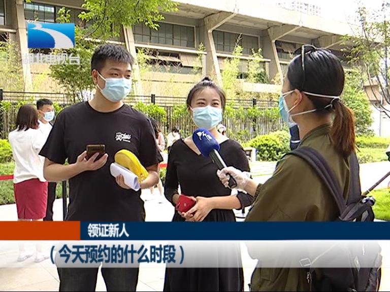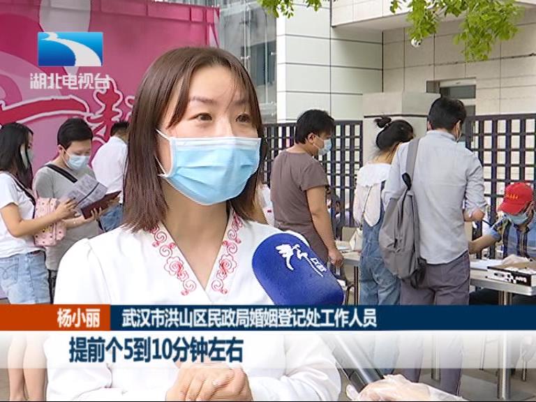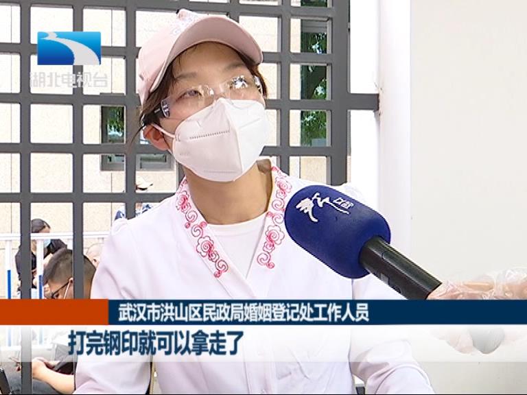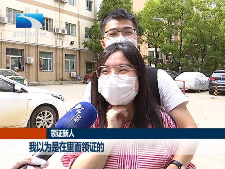 武汉市洪山区民政局婚姻登记处工作人员 杨小丽:预约新人迟到的是没有的,大家都非常准时。提前个5到10分钟左右,来了就可以办,办了就可以走,所以基本上今天是没有出现聚集的情况。对于没有预约的,我们另外专门设了窗口,会跟他们审核证件,为他们发号,差不多一个流程下来要15分钟左右。