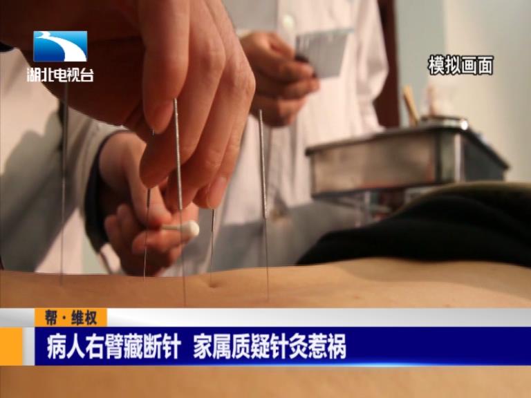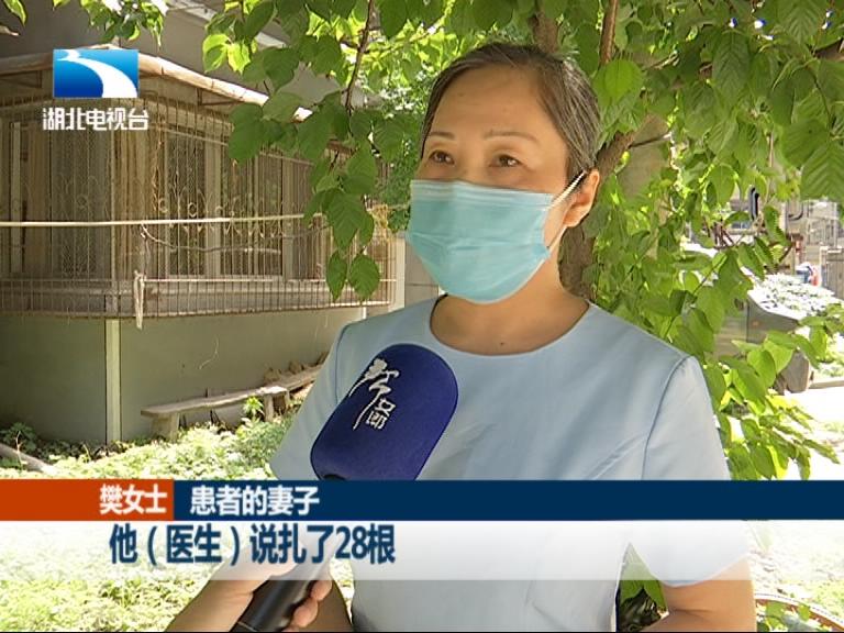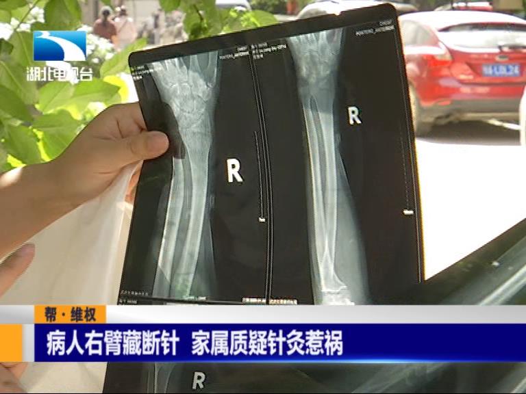 患者的女儿 余女士:扎了35根针,到了10点钟还不到的时候来拔针,只有34根针。到了晚上7点钟,我父亲抱着这个手臂在哭,我跟我母亲就把他衣服都解开,然后就发现这里有根针在弯曲着。我们把它拿下来了,去交给当时的值班医生。