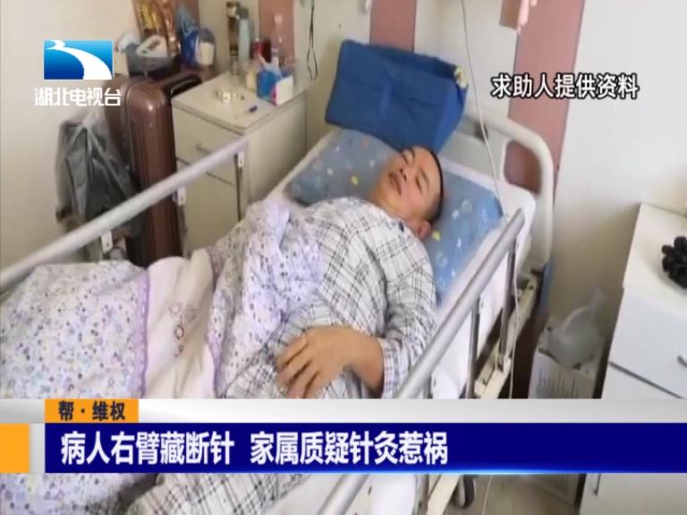去年11月18日,余女士的父亲因为突发脑溢血做完开颅手术后,转至武汉红桥脑科医院进行康复治疗。今年1月6号,院方跟于女士说,X光片显示,她父亲的右手臂里面有一处断针。断针隔天就做手术取了出来。针取出来了,但这根针是什么针?从哪儿来?又是怎么扎进余女士父亲手臂的呢?余女士告诉帮女郎,她找过院方,院方声称这根针一个月前就已经存在了。