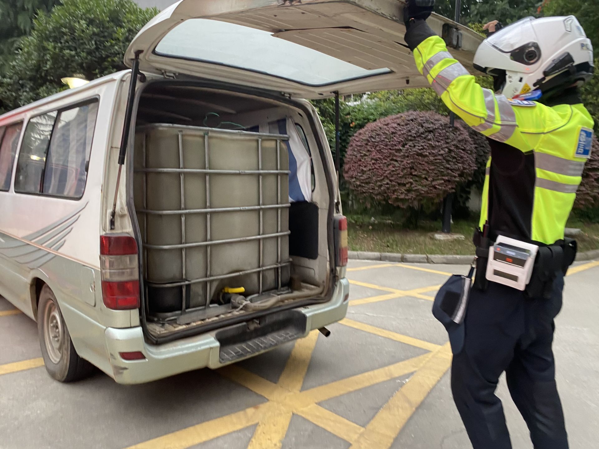 载客面包车后排座椅全部拆除,非法改装罐体运输柴油,不料却被江汉交警查获,司机面临重罚后悔不跌。