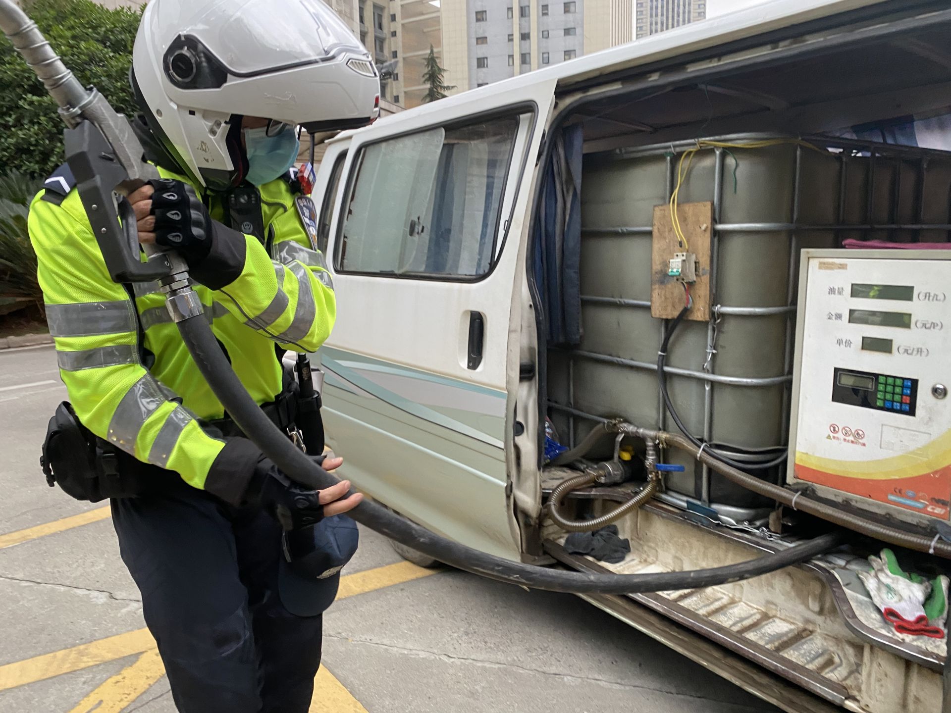 经询问司机吴某某得知,车内装载了一吨柴油,准备运往长江边某沙场给挖掘机加油。从4月份我市“解封”以来,吴某某便将面包车改装,并加装了简易加油设备,专门到工地给工程机械车加油。民警随即对吴某某进行了严厉的批评,并告知其柴油属于易燃易爆危险品,必须由专项作业车和专业人员运载。