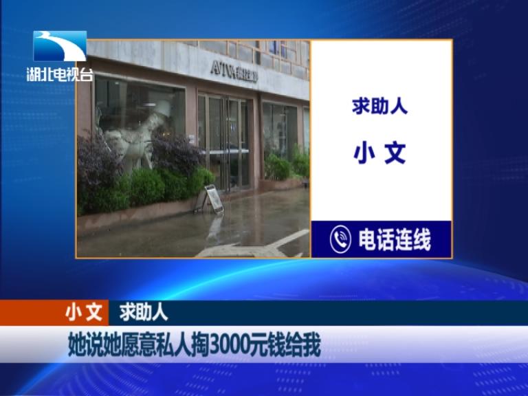 求助人 小文:她说她愿意私人掏3000元钱给我,气也出了,然后我是个人卖了她一个面子吧,还是很谢谢你们的。