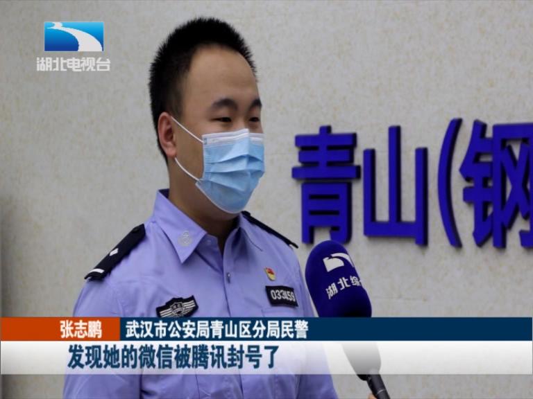 武汉市公安局青山区分局民警 张志鹏:第二天她登录她的微信,发现她的微信被腾讯封号了,显示涉嫌诈骗和骚扰信息。