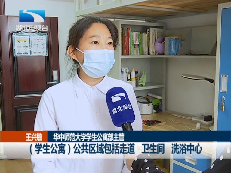 华中师范大学学生公寓部主管 王兴敏:按照防控指挥部要求,学生公寓公共区域包括走道、卫生间、洗浴中心,我们用84消毒液,每天两遍消杀。学生寝室里面 ,我们开门 开窗通风,然后用酒精擦拭门窗。