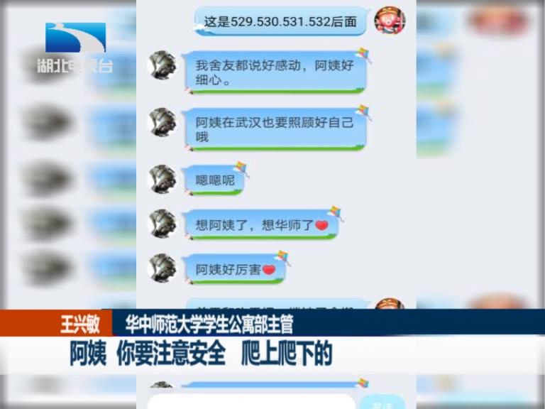 华中师范大学学生公寓部主管 王兴敏:我们给他们晒被子的同时,他们叮嘱我们阿姨。阿姨,你要注意安全,爬上爬下的。我说孩子你们放心,会注意的。他们说,你像妈妈这样对我们,我们会好好学习报效祖国。听到这个话,眼泪就流下来,蛮感动的,因为像自己的孩子一样。