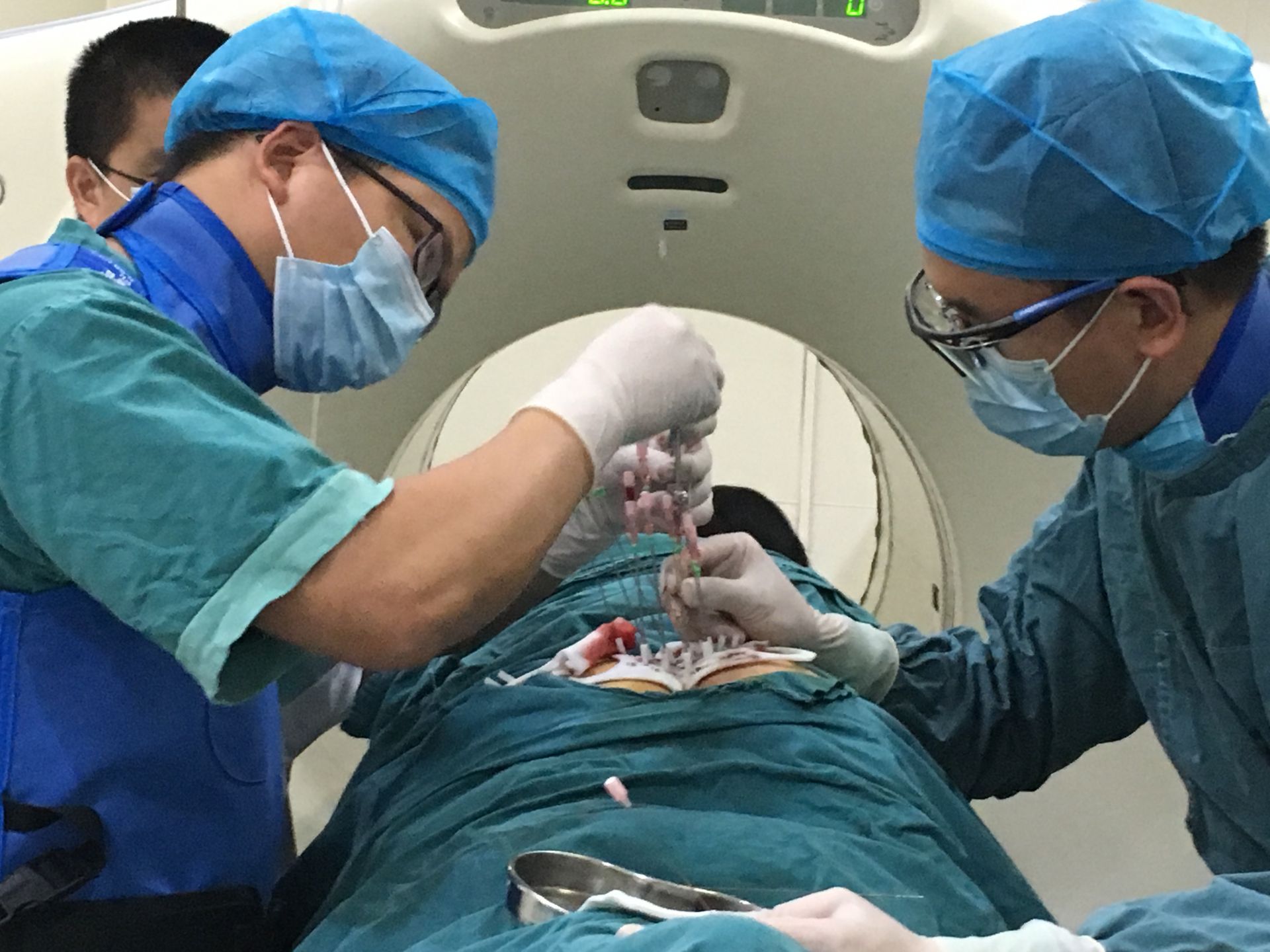 据悉,邓女士两个月前因为盆腔内肿瘤在外院接受了外科切除手术。大约半个月前,她感觉后腰部疼痛,且痛感日益加重,严重影响了正常生活。6月初,她在家人陪伴下来到湖北省肿瘤医院就诊。经检查发现,其骶尾部肿瘤复发导致顽固性腰骶部疼痛,已经不符合再次手术切除指征。医院胸内科、放射科、核医学科等多科室专家经过联合讨论,决定为其进行碘125放射性粒子植入术——将放射性粒子植入肿瘤病灶内,让放射性粒子释放γ射线持续照射杀伤肿瘤细胞,从而达到局部治疗或缓解症状的目的。