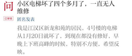 近日,武汉市江汉区新龙和苑的居民反映,他们小区4号楼的楼栋仅有一部电梯能使用,另外一部电梯从今年1月20日就已经坏了,一直无人维修,在上下班的高峰时段,居民常常要等10多分钟才能乘坐电梯,十分不便。近期,也有居民在长江云“热线”平台上进行了反映。