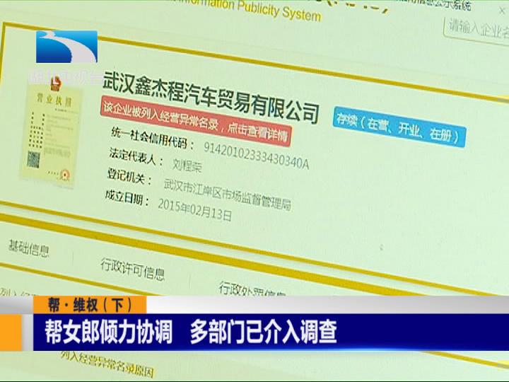 帮女郎何粹查询了解到,武汉鑫杰程汽车贸易有限公司因为“通过登记的住所或者经营场所无法联系”已经被列入了经营异常名录。对此,张大姐说很担心对方跑路,于是,帮女郎何粹又和张大姐一起来到当时购车地所属辖区的武汉市汉阳区武汉国际博览中心派出所报案。目前,公安机关已介入调查。而就在当天帮女郎离开派出所没多久,汽车公司刘老板却主动打来了电话!