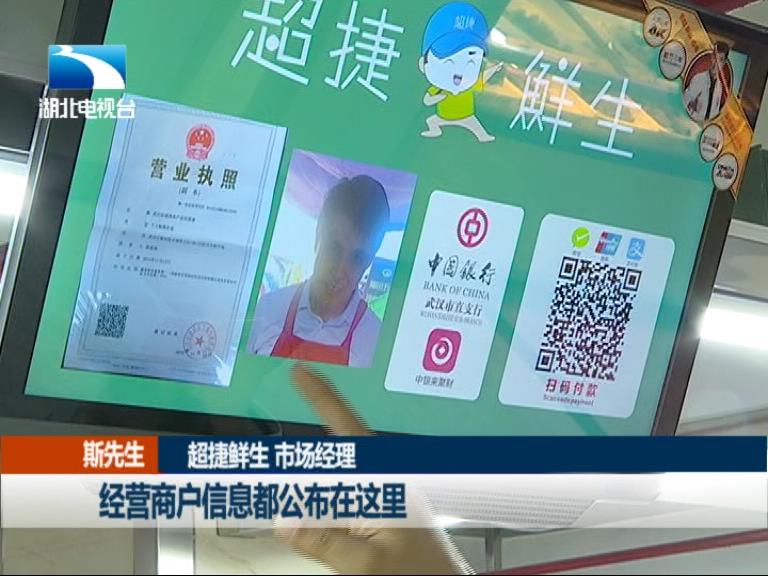 超捷鲜生市场经理 斯先生:它是一个数字化的显示器,首先第一个诚信经营,经营商户信息都公布在这里,让顾客一眼看到他是谁、做什么的。第二个顾客可以扫码付款,后期我们还会增加菜价之类的公示。