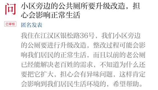 杨先生住在江汉区银松路36号居民楼,最近他们小区旁边的公共厕所贴出通知,近期要升级改造。他认为原来的旧公厕已经能够满足老百姓的需求,没必要再扩大,而且扩大一定会影响到他们这栋楼的居民,担心会出现异味等问题。近期,杨先生针对这件事情在长江云“热线”平台也进行了反映。