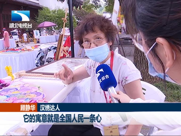 汉绣达人 顾静华:这一幅画我选材是因为它是一颗心,这颗心是叫万众一心。它有各个单位 有个人组成,它的寓意就是全国人民一条心,把这一次的疫情战胜。