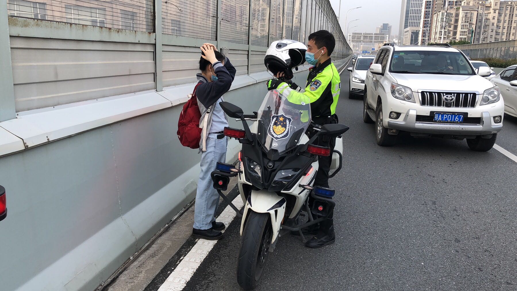 当日上午7时30分左右,洪山区交通大队二中队快骑队员汤鸣宇、邱文乐在二环线雄楚高架巡逻时,发现一名身穿校服背着书包的女孩在高架桥上行走。正值早高峰时段,高架桥员上车流大、车速快,不时有车辆从其身边呼啸而过,情况十分危险。快骑队员见状,立即上前询问情况。得知女孩是武汉市三十九中的一名高三学生,早上搭乘出租车去学校上课,出租车行驶至二环线雄楚高架桥上时,与其他车辆发生了交通事故,女孩只好下车,并准备步行下高架桥换乘。当走到二环线尤李村立交附近时,由于下匝道口较多,女孩突然迷失了方向,正不知所措时,被巡逻的洪山交警发现了。