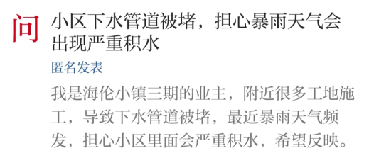近期,海伦小镇三期的业主在长江云“热线”平台上反映,现在小区附近有很多工地在施工,导致下水管道被堵。最近暴雨天气频发,她担心小区下水管道排水不畅,会出现严重积水的现象。
