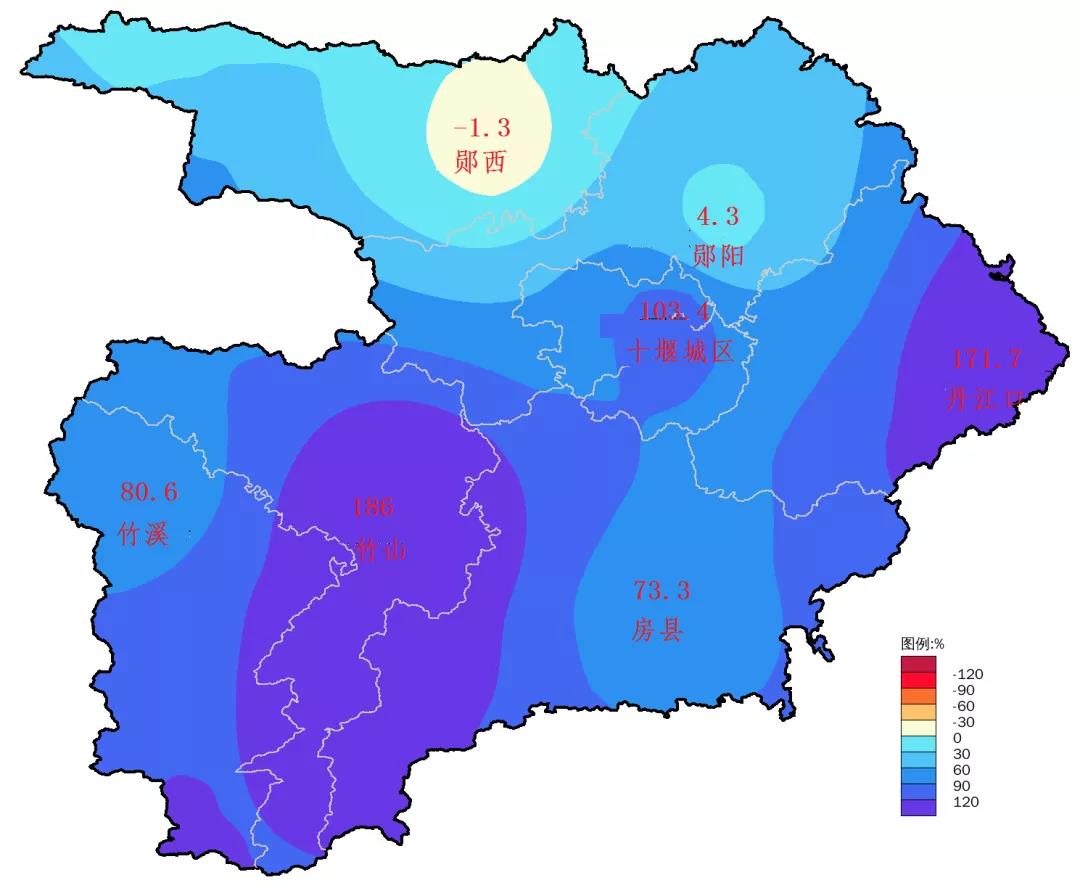 十堰市2020年6月8日至7月12日降雨历史距平分布图