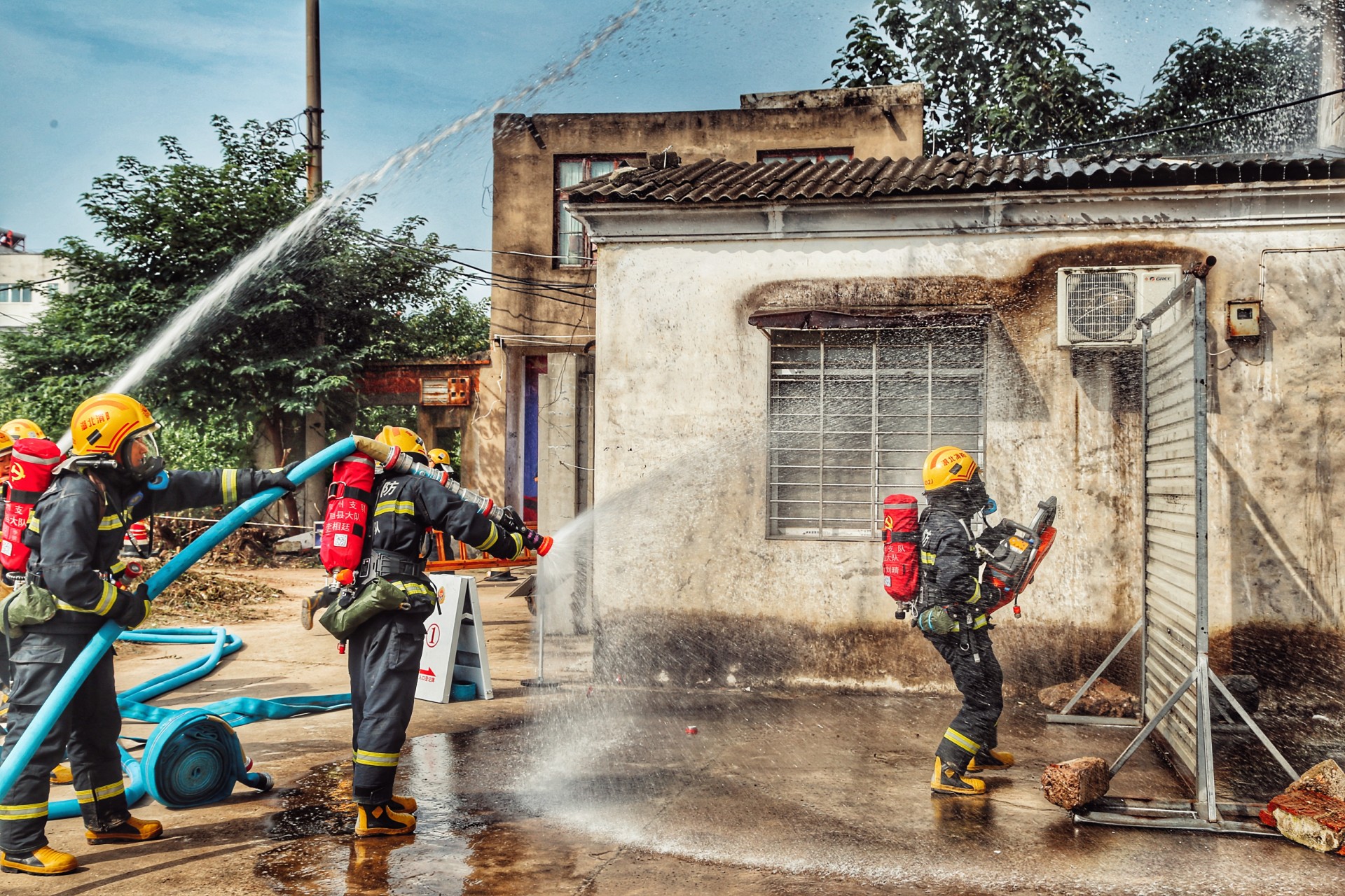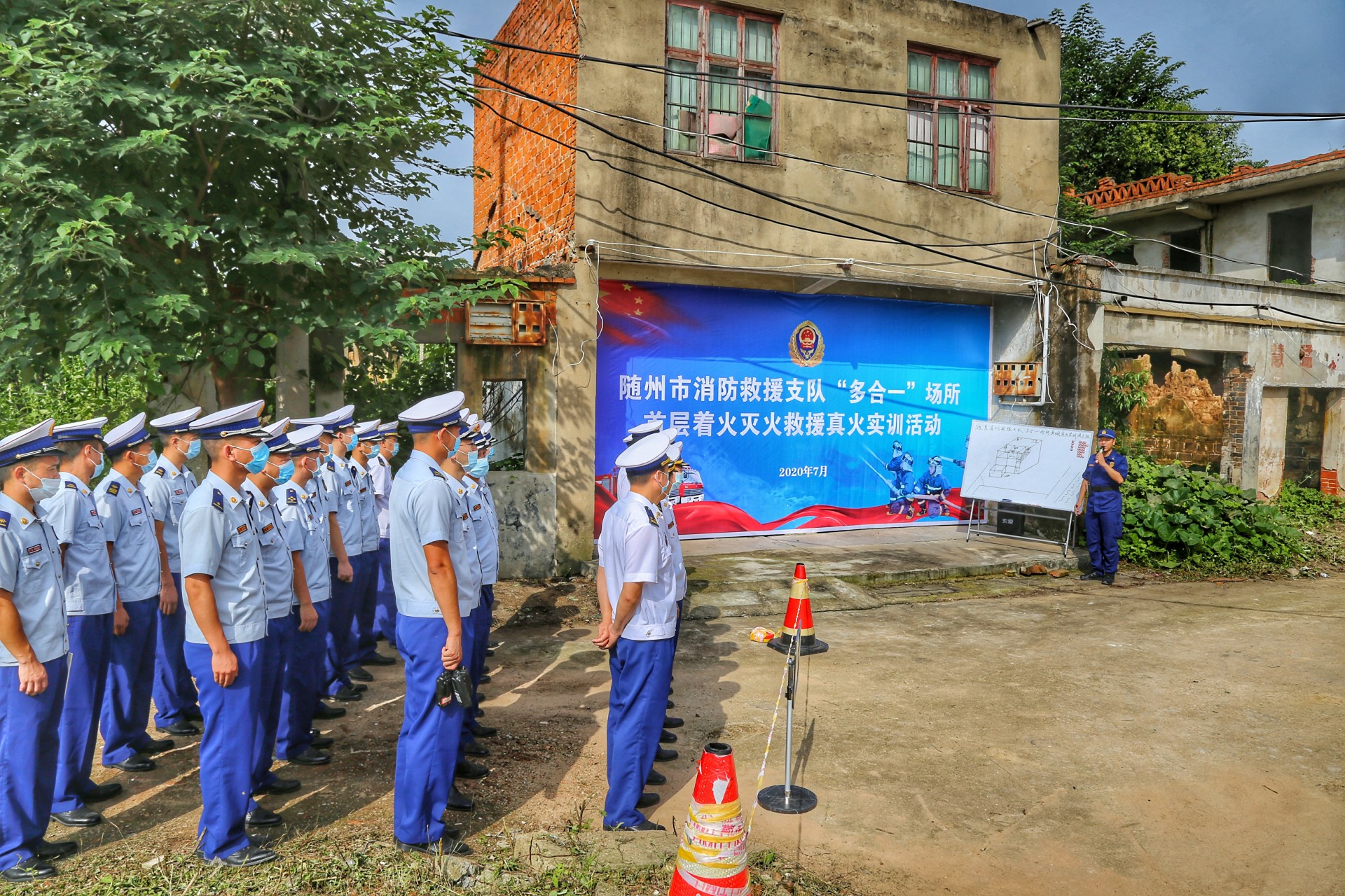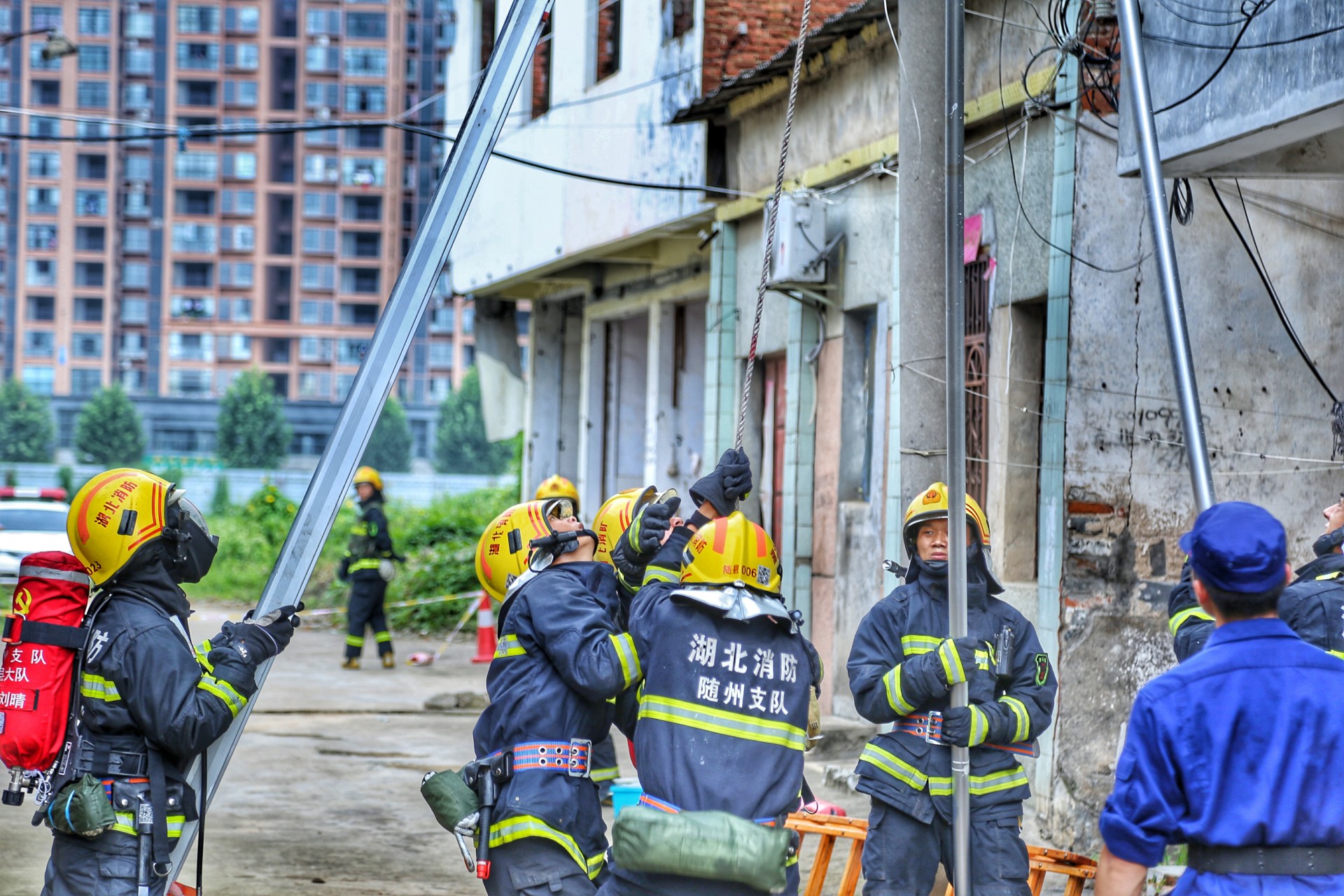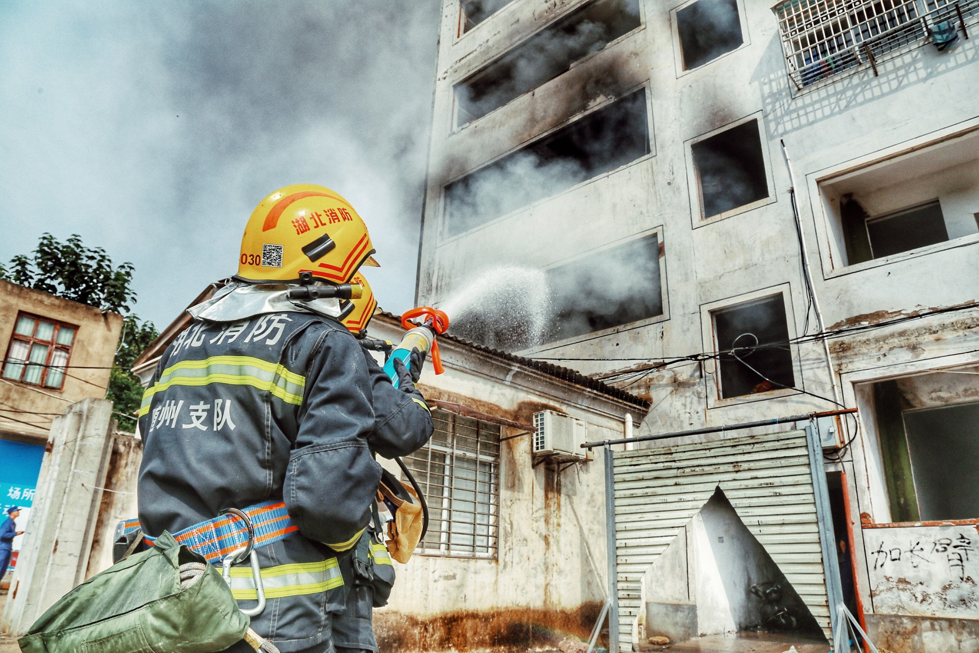 7月29号上午9点,随着一声令下,随州消防救援支队举行的“多合一”场所真火实景演训活动正式开始。演练假设随县一社区内一栋自建民房,因电线老化引发火灾。该民房一层为摩托车修理店,二层、三层为人员居住。随县消防救援大队接到出警命令后,迅速调集抢险救援车、城市主站车、泡沫水罐车等4车15人到场处置。侦察警戒组立即对现场情况进行侦察,并设置入口指挥,在一组人员破拆卷帘门的同时,另一组攻坚人员利用六米拉梯开通第二救生通道,供水组进行持续供水。侦查搜救组在水枪的掩护下,迅速将被困人员转移到安全区域。经过30多分钟的持续作战,大火被彻底扑灭。