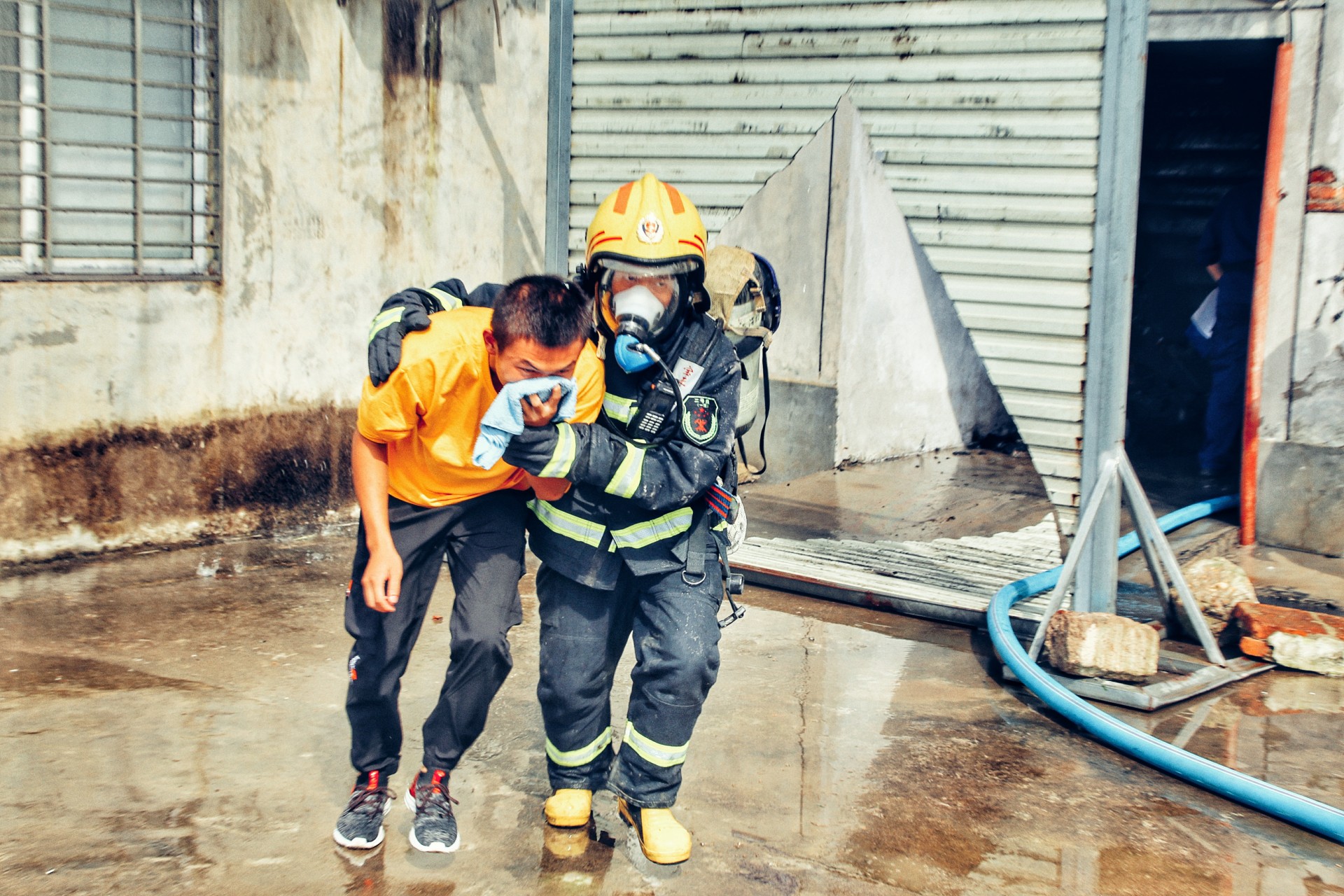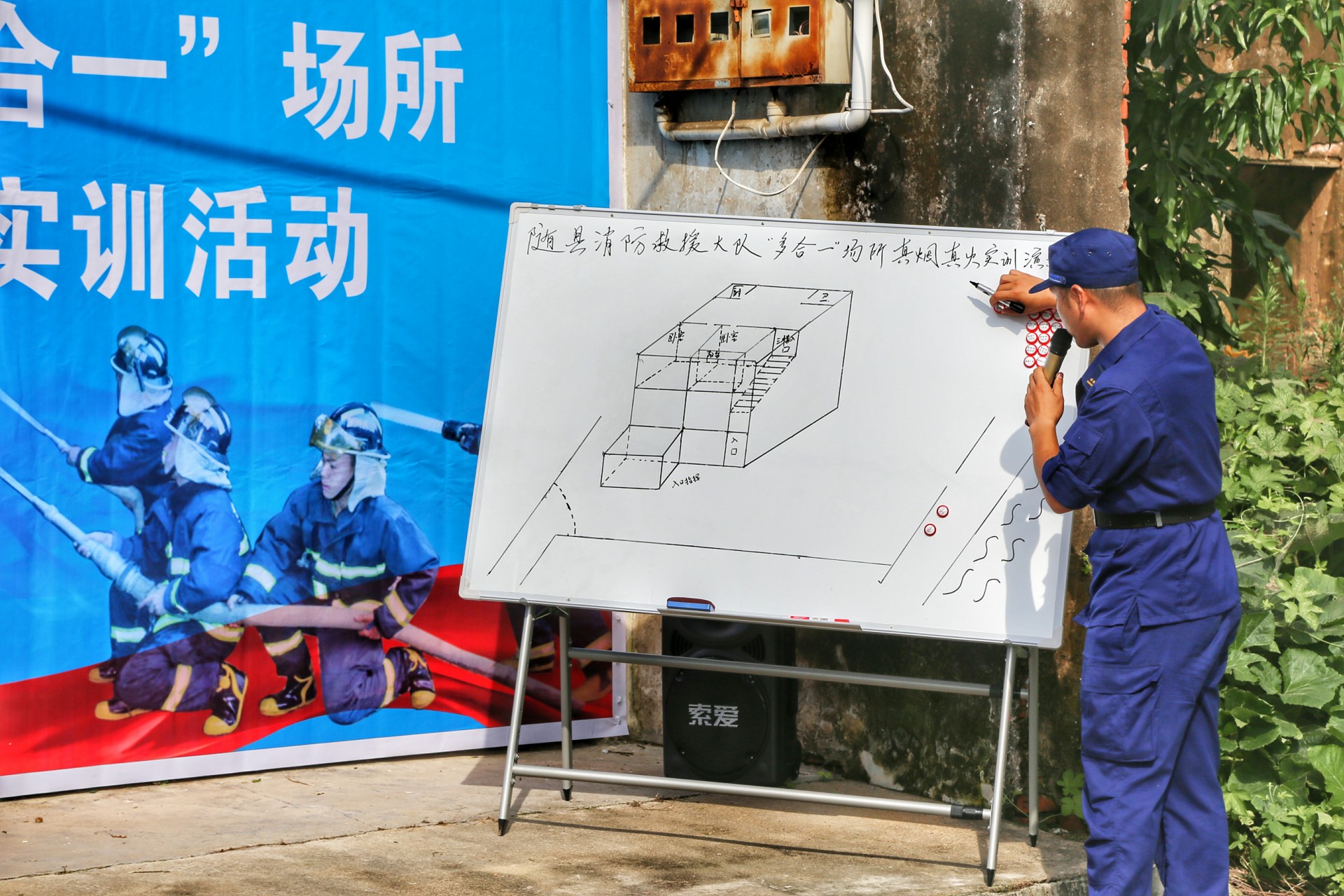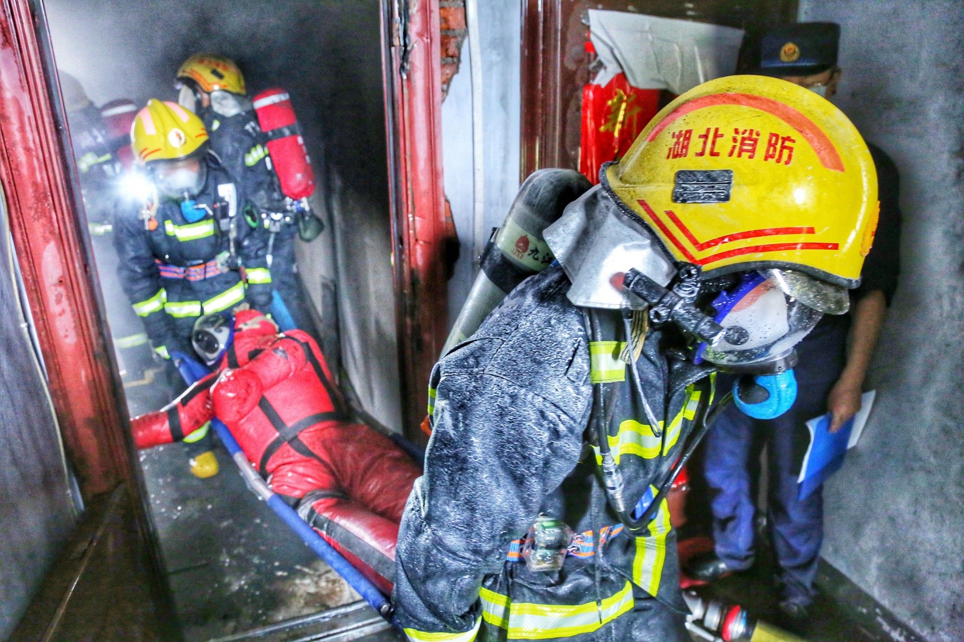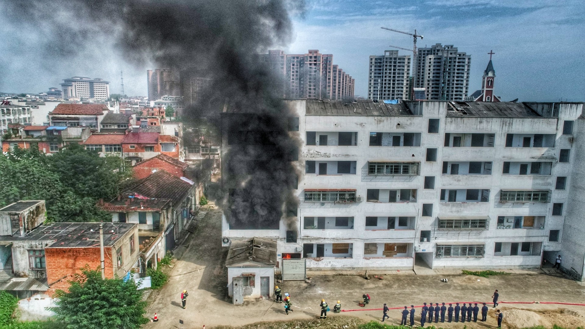 7月29号上午9点,随着一声令下,随州消防救援支队举行的“多合一”场所真火实景演训活动正式开始。演练假设随县一社区内一栋自建民房,因电线老化引发火灾。该民房一层为摩托车修理店,二层、三层为人员居住。随县消防救援大队接到出警命令后,迅速调集抢险救援车、城市主站车、泡沫水罐车等4车15人到场处置。侦察警戒组立即对现场情况进行侦察,并设置入口指挥,在一组人员破拆卷帘门的同时,另一组攻坚人员利用六米拉梯开通第二救生通道,供水组进行持续供水。侦查搜救组在水枪的掩护下,迅速将被困人员转移到安全区域。经过30多分钟的持续作战,大火被彻底扑灭。