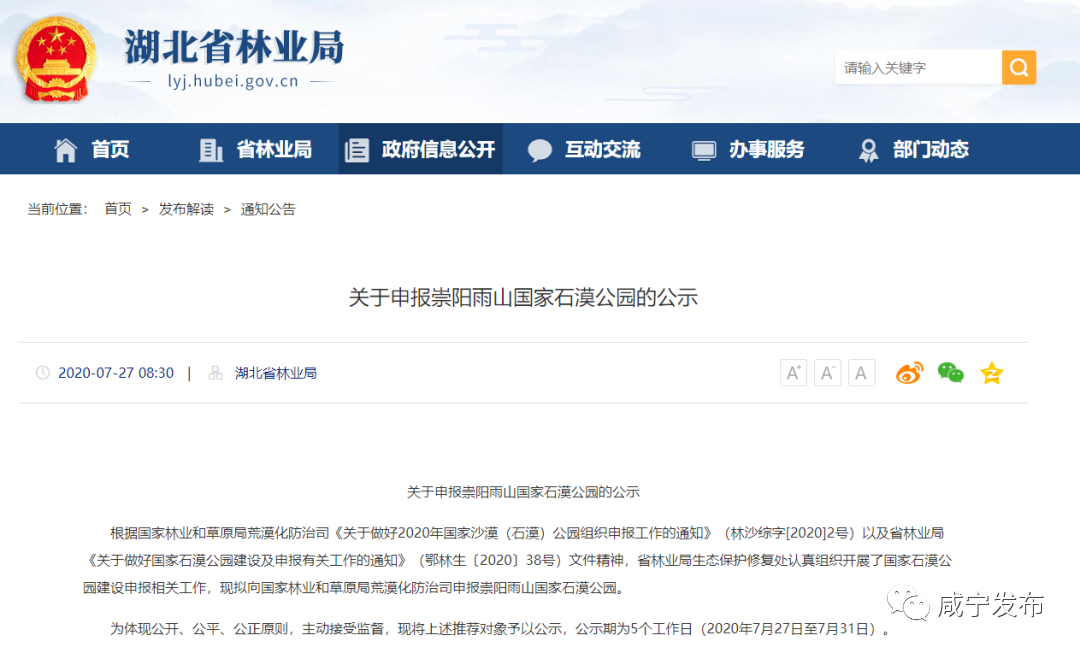 湖北省林业局近日对崇阳雨山申报国家石漠公园进行公示