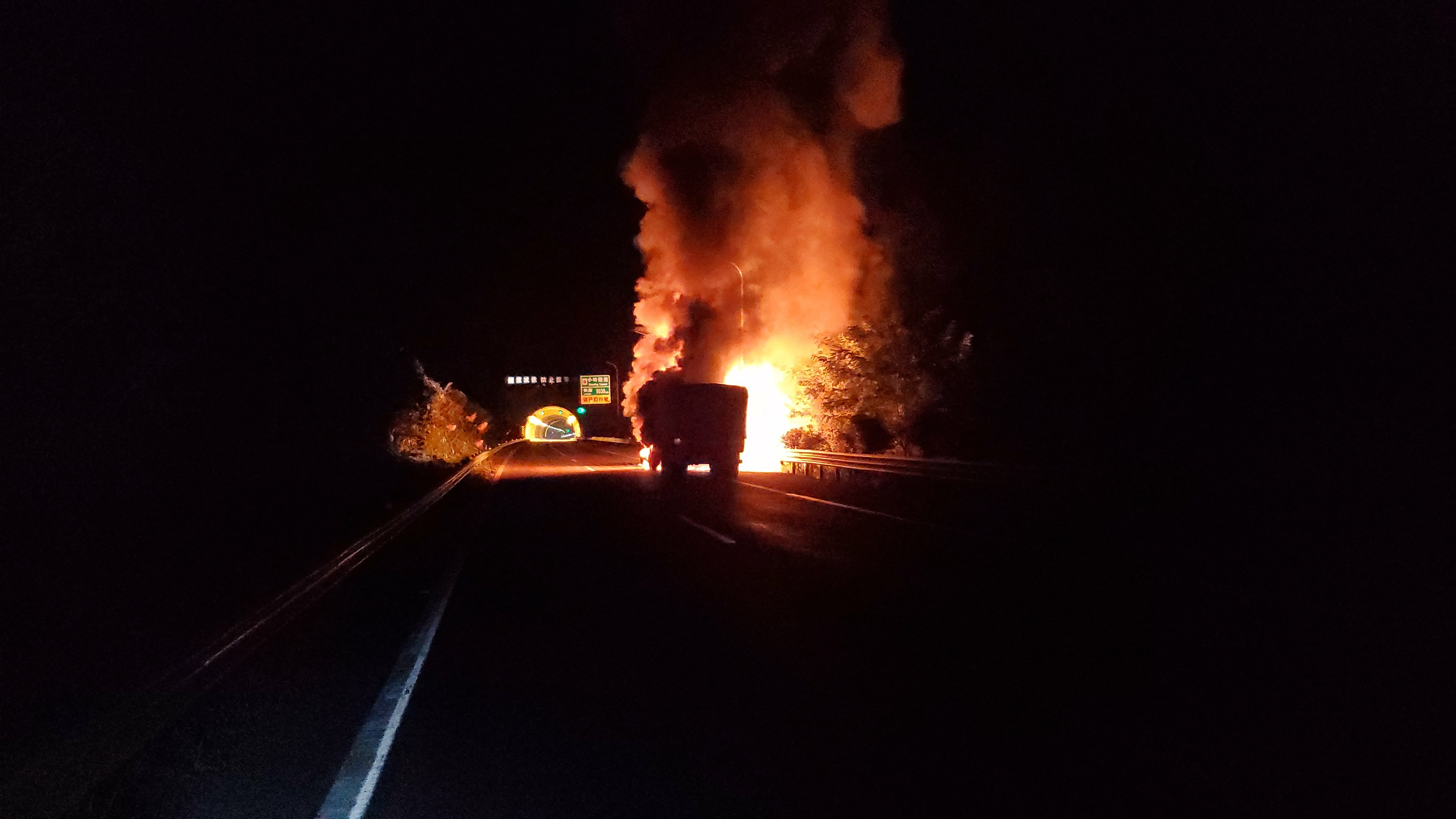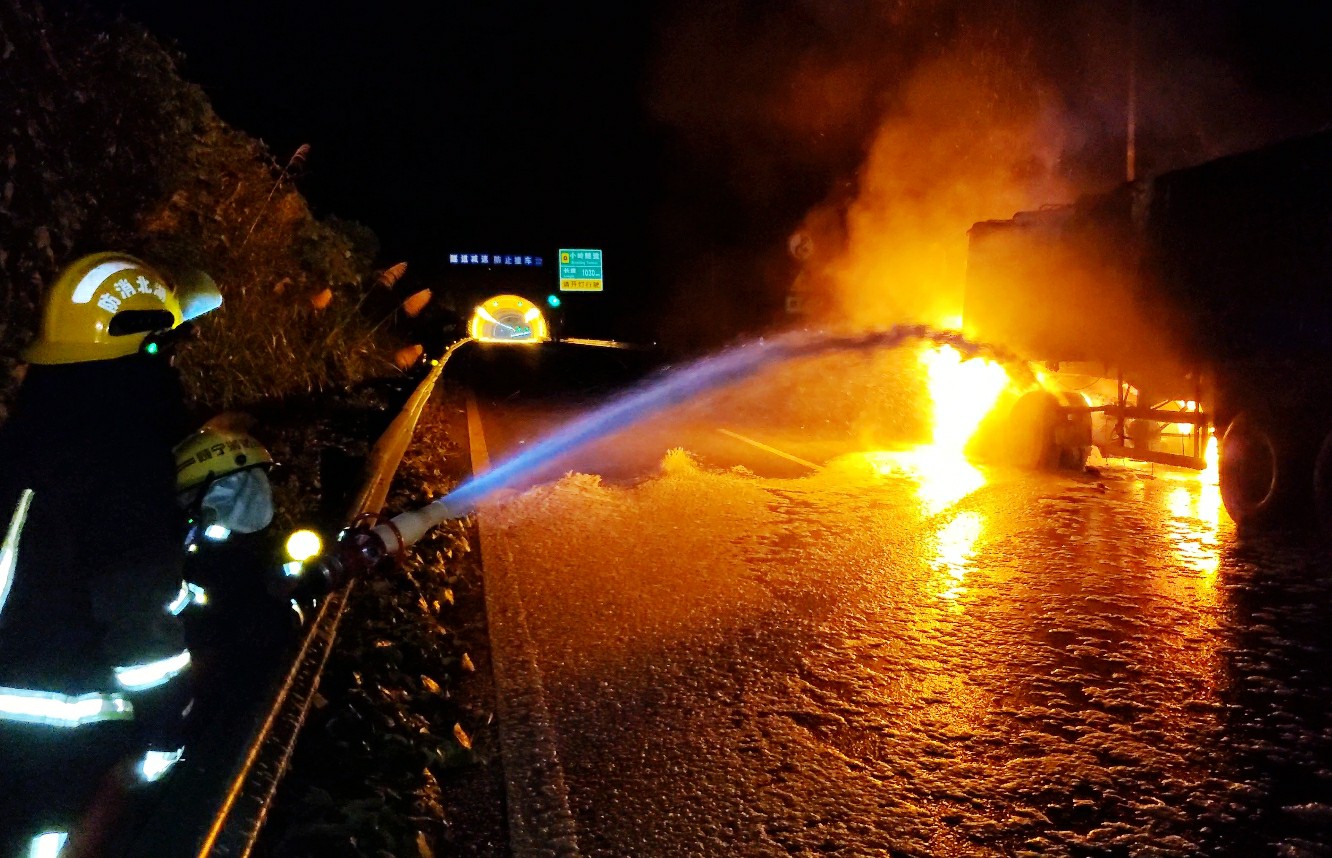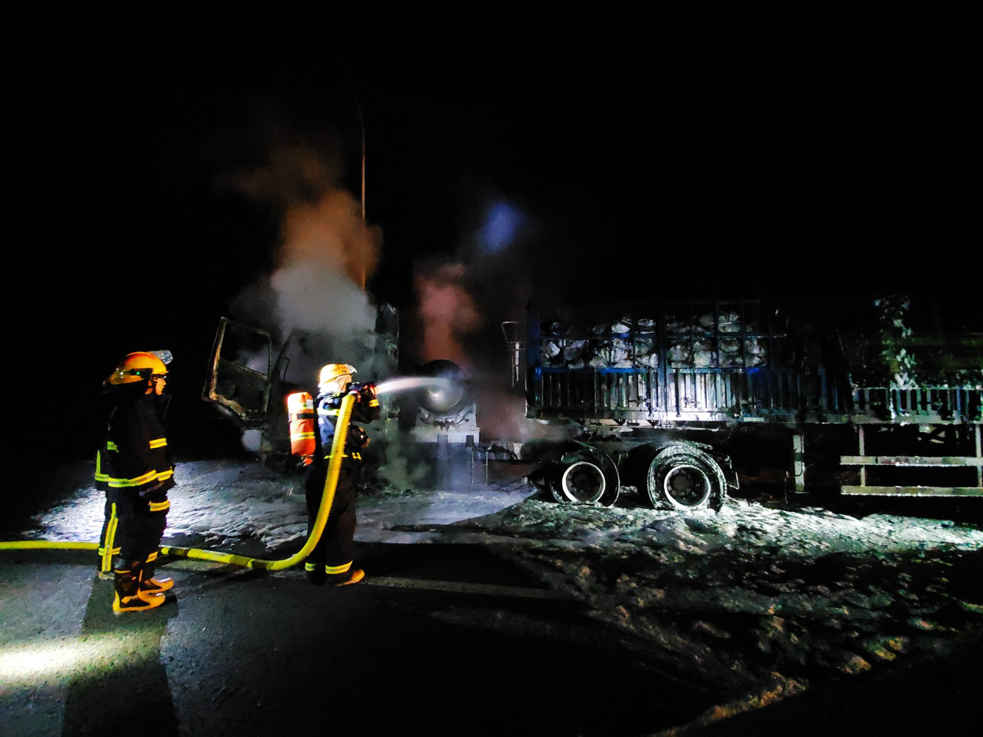 8月6号晚上,咸宁市马桥收费站往通山方向一半挂车,在行驶途中突然起火。当地消防火速赶赴现场处置。消防救援人员在现场看到,起火点位于挂车车头的后方,那里连接着挂车的动力燃料罐,里面的天然气,正在不断泄漏燃烧,情况十分危急。而后面的货箱中装满了氢氧化钠,一旦接触到水,就会大量放热。根据现场情况,消防员采取用水枪和泡沫枪,一边对火势进行反复压制,一边对未着火的车体进行冷却降温。40分钟后明火终于被扑灭。
