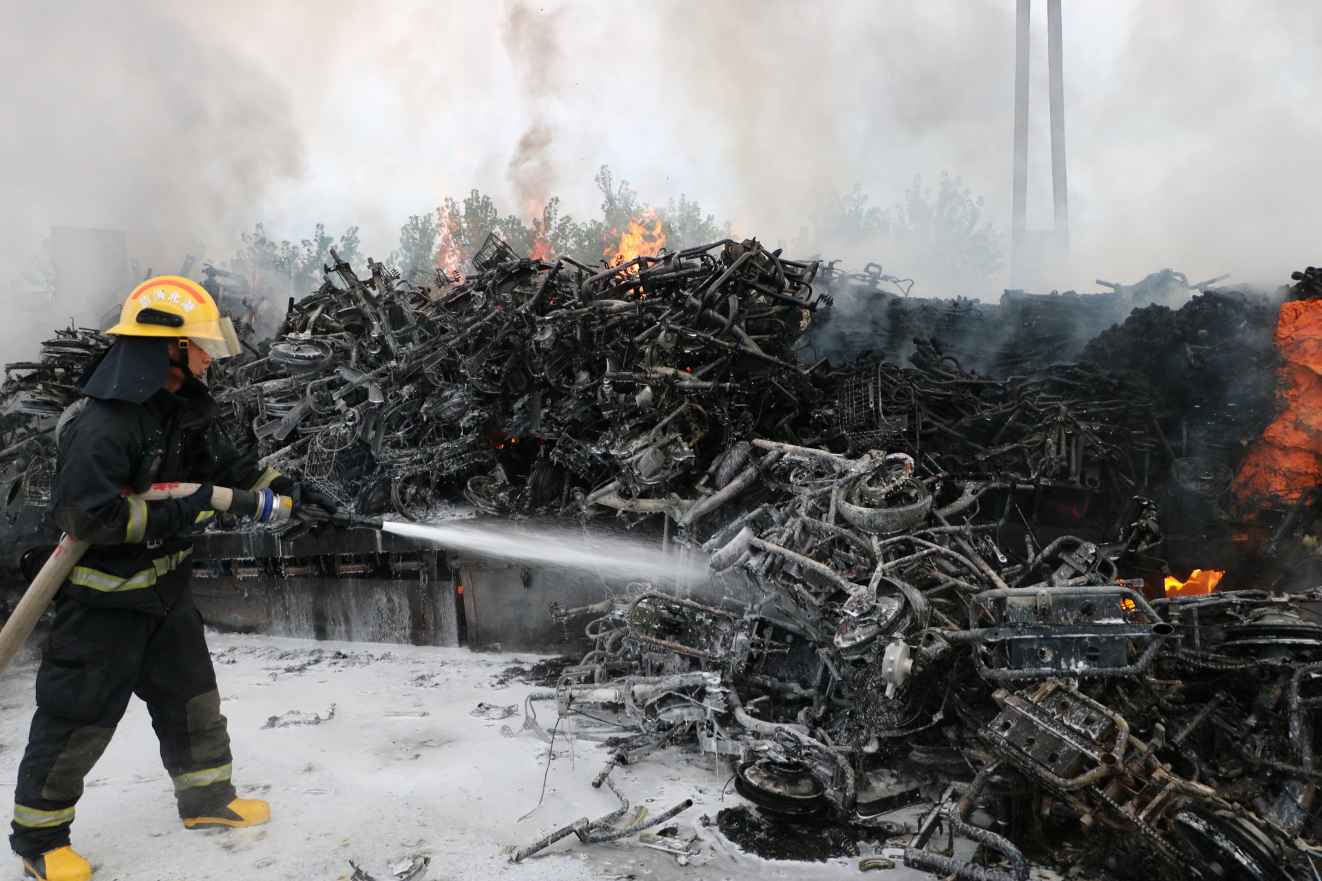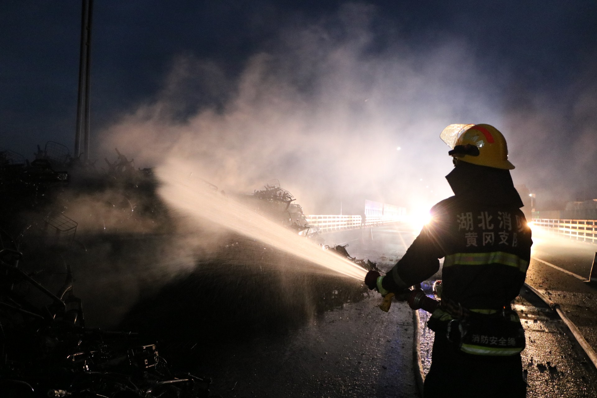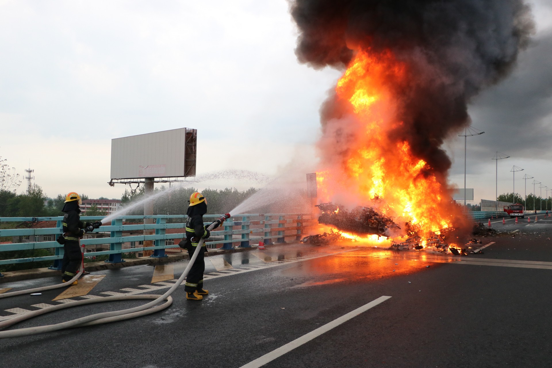 消防救援人员到达事故现场,发现整个车厢正猛烈燃烧,并发出巨响,威胁过往车辆安全。消防员立即出两只水枪,进行冷却覆盖,然后逐一清理车上余火,经过近1个小时的紧张扑救,大火被扑灭,高速恢复通车,但整个挂车车箱及装载的近500辆电瓶车被全部烧毁。