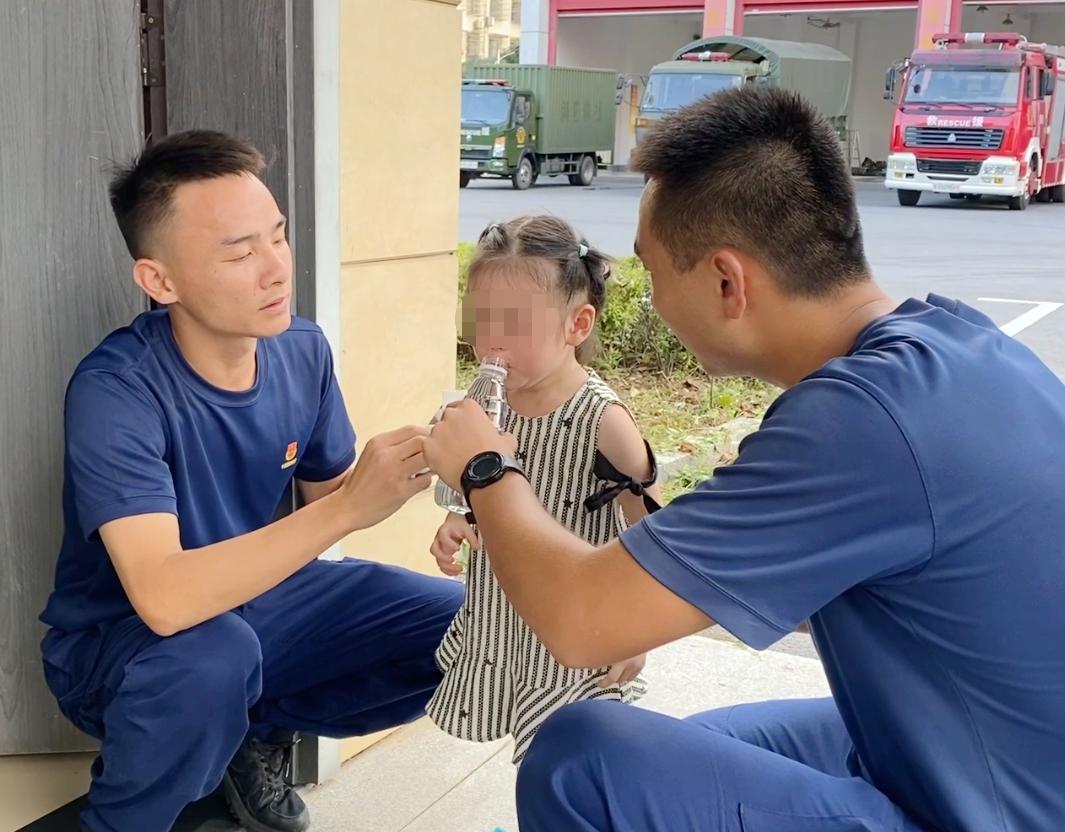 东风路消防救援站站长甘甜、消防员孙德鑫不断安抚这名小女孩情绪,给孩子喂水。见小女孩不能说出家的地址,但总往一个方向指,消防员按照小女孩指的方向找到找到一个小区后,与物业人员沟通,让物业工作人员将走丢小女孩的照发在业主群里,询问业主是否走丢了孩子。