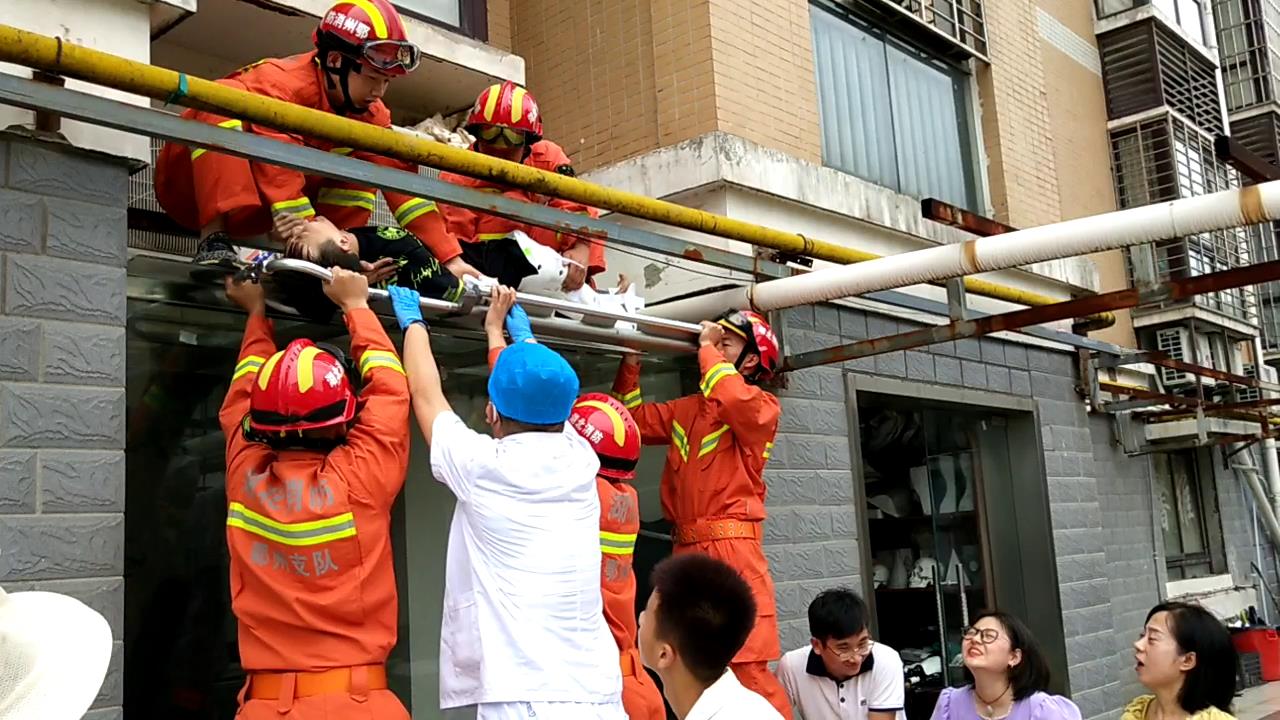 勘察现场后,消防救援人员发现该栋居民楼四楼外正好有一个约50厘米宽的小玻璃平台,男孩幸运的被该 平台接住,但高空坠落导致男孩受伤,无法动弹,施救难度高。