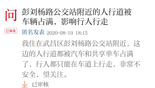 近日,有武汉市民在长江云“热线”平台上反映,武昌区彭刘杨路公交站附近由于人行道被车辆占满,行人只能在车道上行走,很不安全。