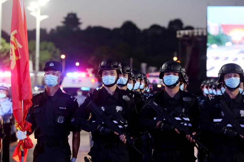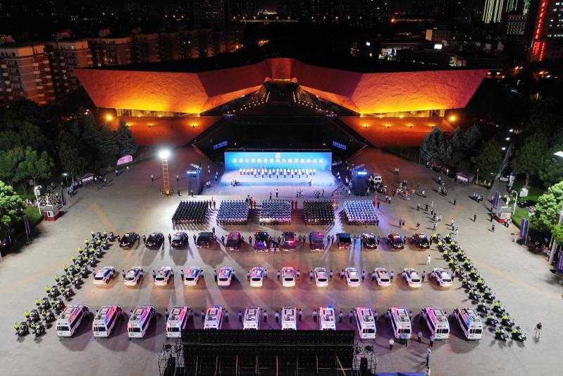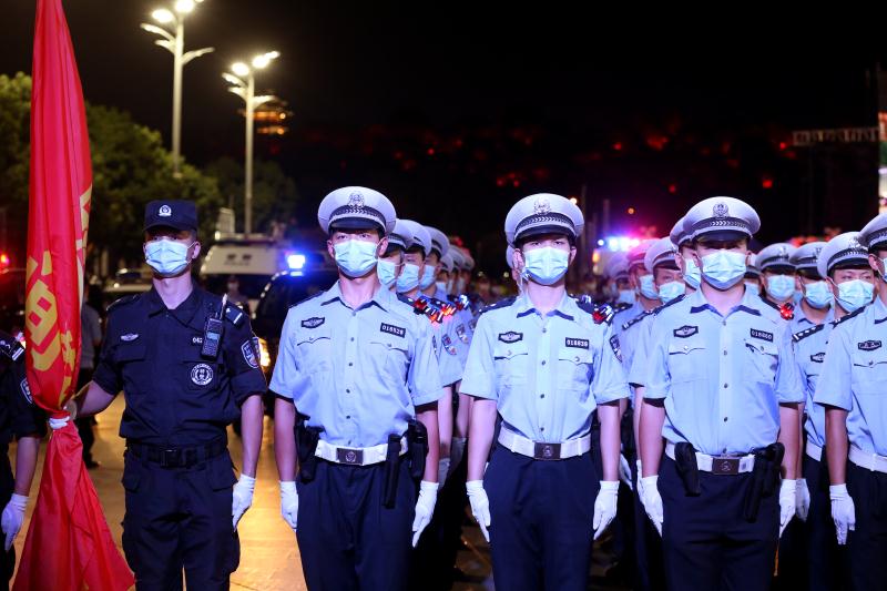 8月26日晚8时,武汉首义广场上警灯闪闪,“枭龙”、“剑齿虎”装甲车、“霸道”巡逻车、智能巡控车、“汉警快骑”摩托车列阵齐整。武汉市公安局各直属单位负责人组成的警官方阵,以及机关民警、交警、特警、巡警、辅警组成的5个民警方阵,500名警力神情庄重。