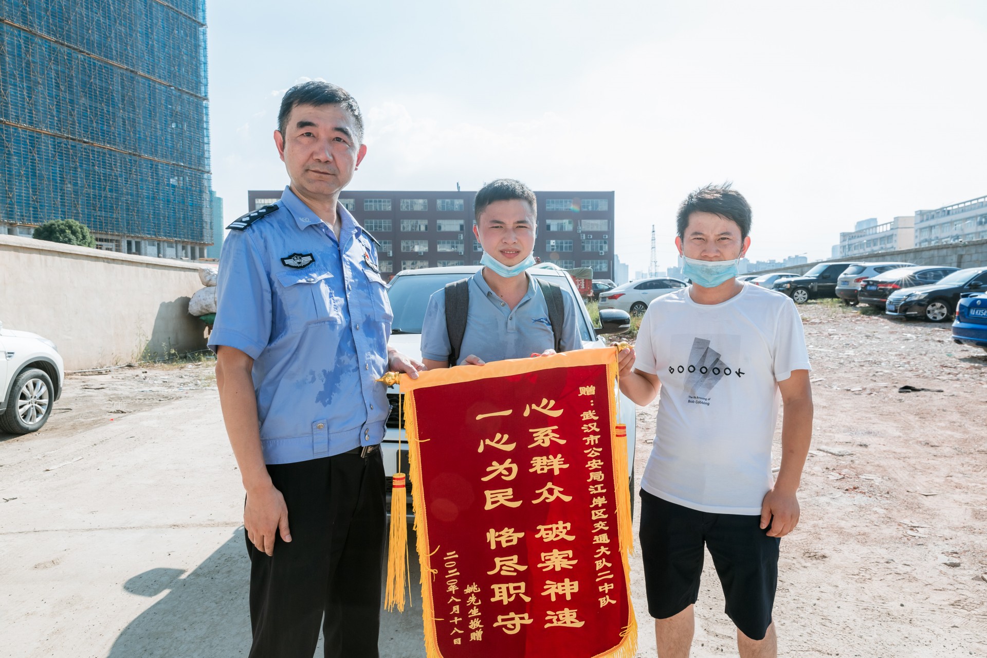 8月18日下午,车主从外地赶到武汉市公安局江岸区交通大队办理车辆交接手续。看着丢失了许久的车子终于失而复得,车主高兴激动的心情溢于言表。对办案民警连连道谢,并送上了一幅写有“心系群众 破案神速 一心为民 恪尽职守”的锦旗。据了解,盗抢车团伙已被当地警方抓获,案件正在进一步深挖处理中。