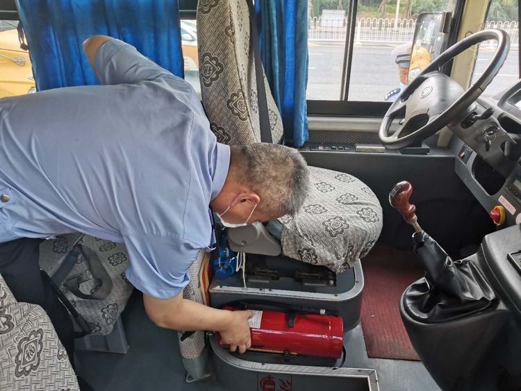 8月26日上午9时许,江岸区中小学、幼儿园24台校车准时赴约进行“体检”,民警对各学校校车数量、安全状况、车辆运行时间、行驶路线、运行管理、驾驶人管理等情况进行重新全面摸排,进一步完善校车管理台帐,做到帐实相符。同时对车辆核载人数、外观标识、校车标志灯、逃生锤、停车指示标志、灭火器、急救箱配备等情况进行逐一检查,并对校车及驾驶人资质进行了审核。检查中,民警发现部分校车存在灭火器临近有效期止、车辆轮胎磨损严重、停车指示标志生锈等问题。
