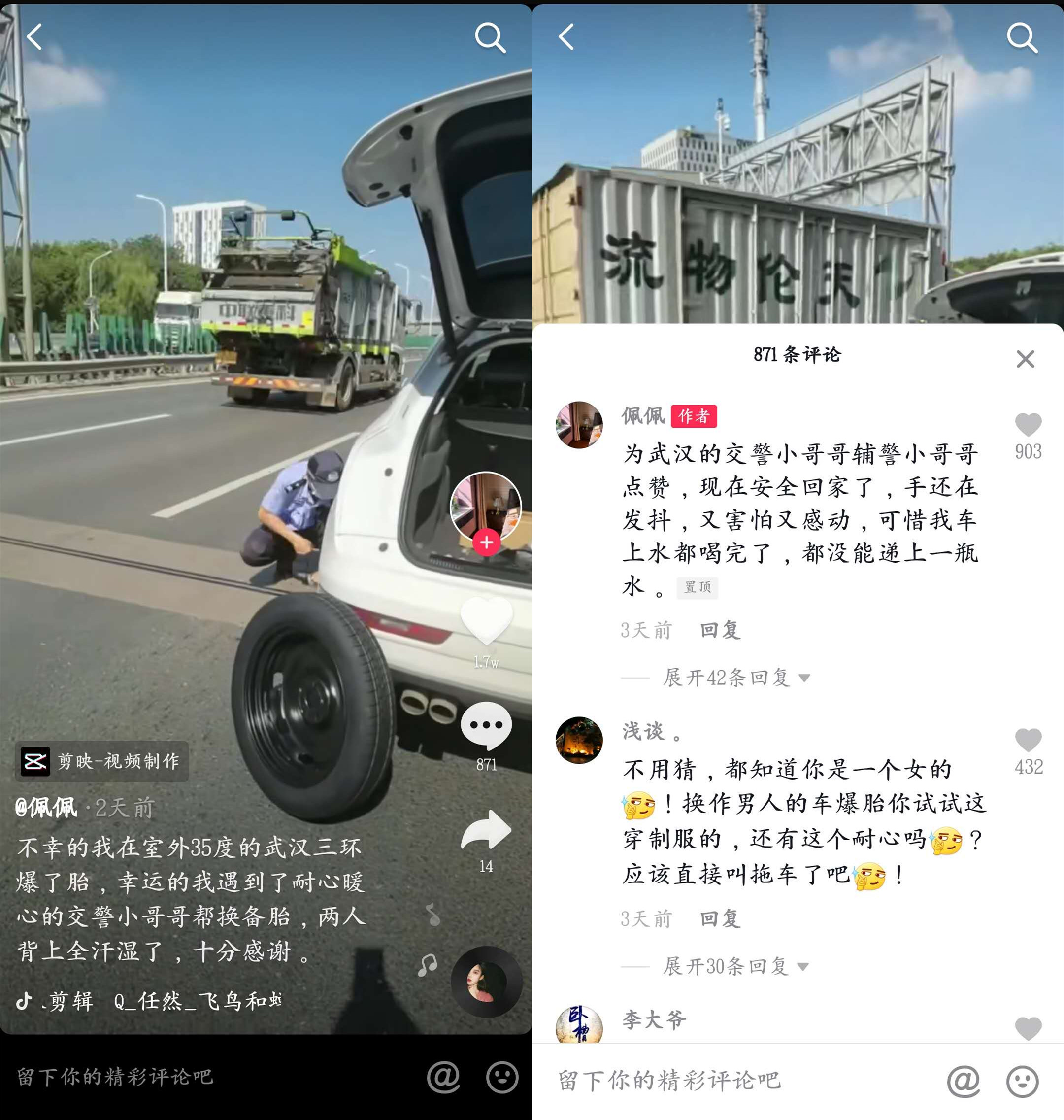 “不幸的我在室外35度的武汉三环爆了胎,幸运的我遇到了耐心暖心的交警小哥哥帮换备胎,两人背上全汗湿了,十分感谢”。8月30日,一则交警在三环线上帮换轮胎的视频被车主发在了抖音,广大网友纷纷点赞。