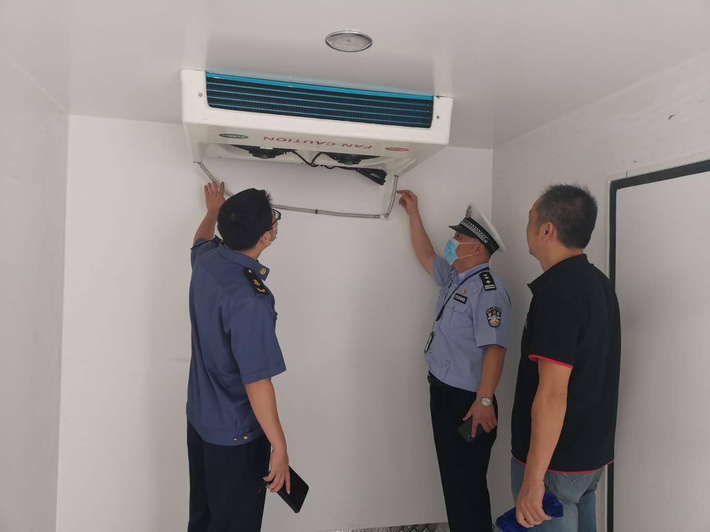 车管民警王震首先对运输车辆的车况进行了查看,包括对冷藏车内的整个冷链系统以及杀虫剂箱的检查。他对企业负责人说道:“冷链系统和杀虫剂箱是防止蔬菜腐烂、催熟、软化,保持高鲜度品质的关键,一定要确保设备正常运转,保证把最新鲜、最安全的蔬菜送到市民的餐桌上。”