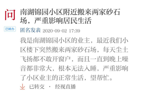 近日,南湖锦园小区的业主刘先生在长江云“热线”平台上反映,武汉市南湖锦园小区10栋的业主们晚上一直休息不好,因为他们楼下的空地上突然搬来了两家砂石场,砂石场上每晚都会持续传来车辆刺耳的鸣笛,大型设备的轰鸣让业主们根本无法入睡。