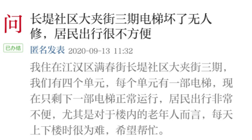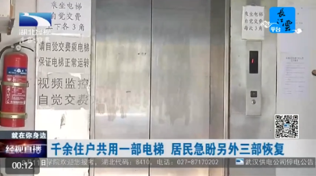 近期,武汉市江汉区满春街长堤社区大夹街三期的居民在长江云“热线”平台反映,他们小区有四个单元,每个单元都有一部电梯,但现在只剩下一部电梯能正常运行,居民出行非常不便。
