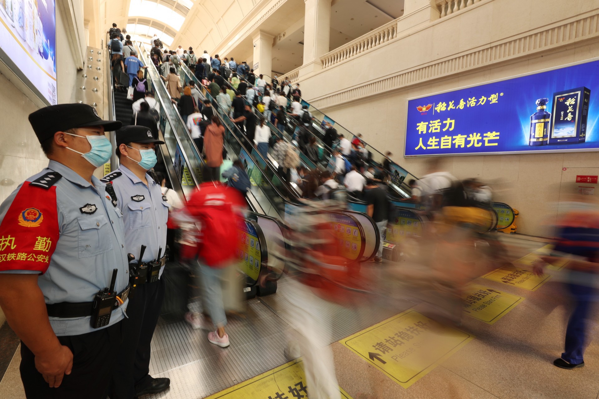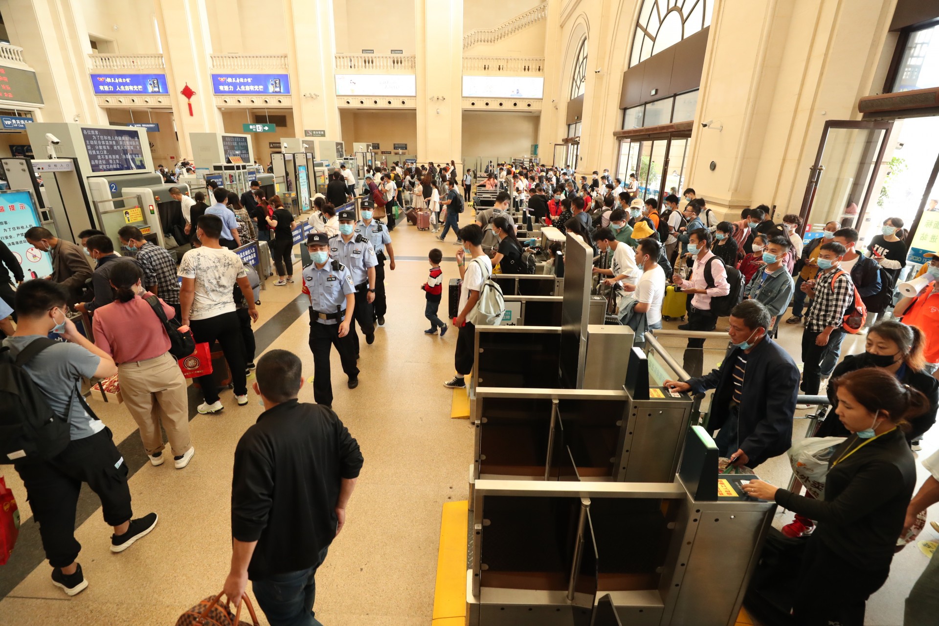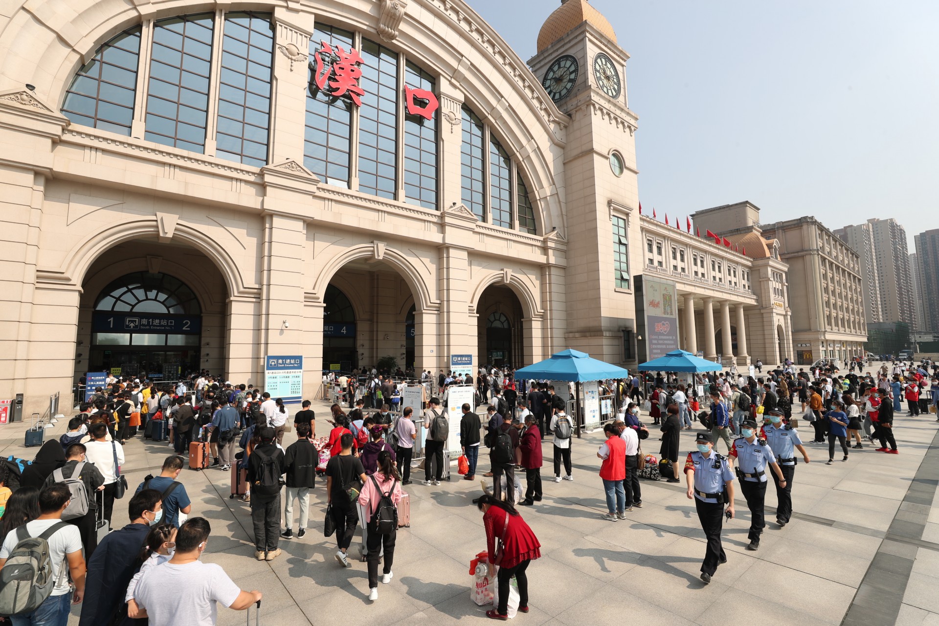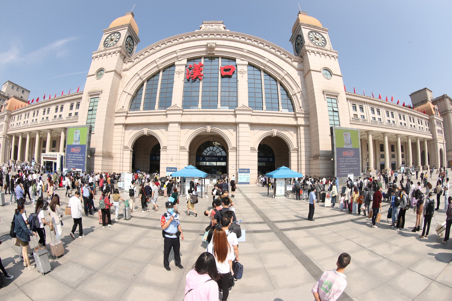 10月1日,湖北武汉。今年黄金周铁路运输期间,时值国庆节、中秋节双节叠加,武汉地区武汉、汉口、武昌等三大火车站迎来客流高峰,武汉铁路公安处民警坚守在岗位上,强化执勤、巡逻和治安面管控,火车站秩序井然。黄金周期间,中国铁路武汉局集团公司铁路客流日均在52.7万人次左右的高位运行,其中9月30日,武昌、汉口、武汉三大火车站当天预计共发送旅客28万人次,创疫情防控以来发送人数新高。