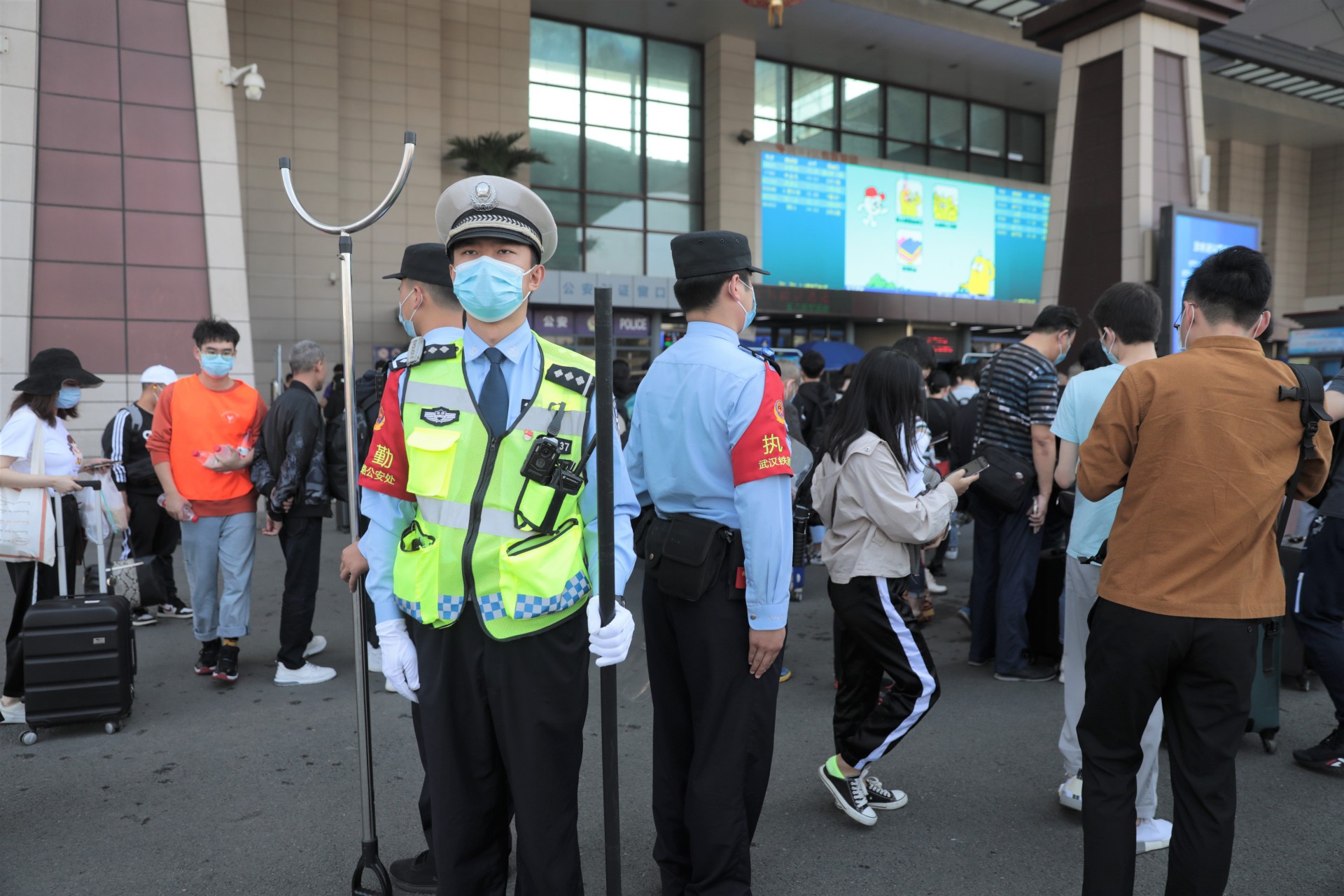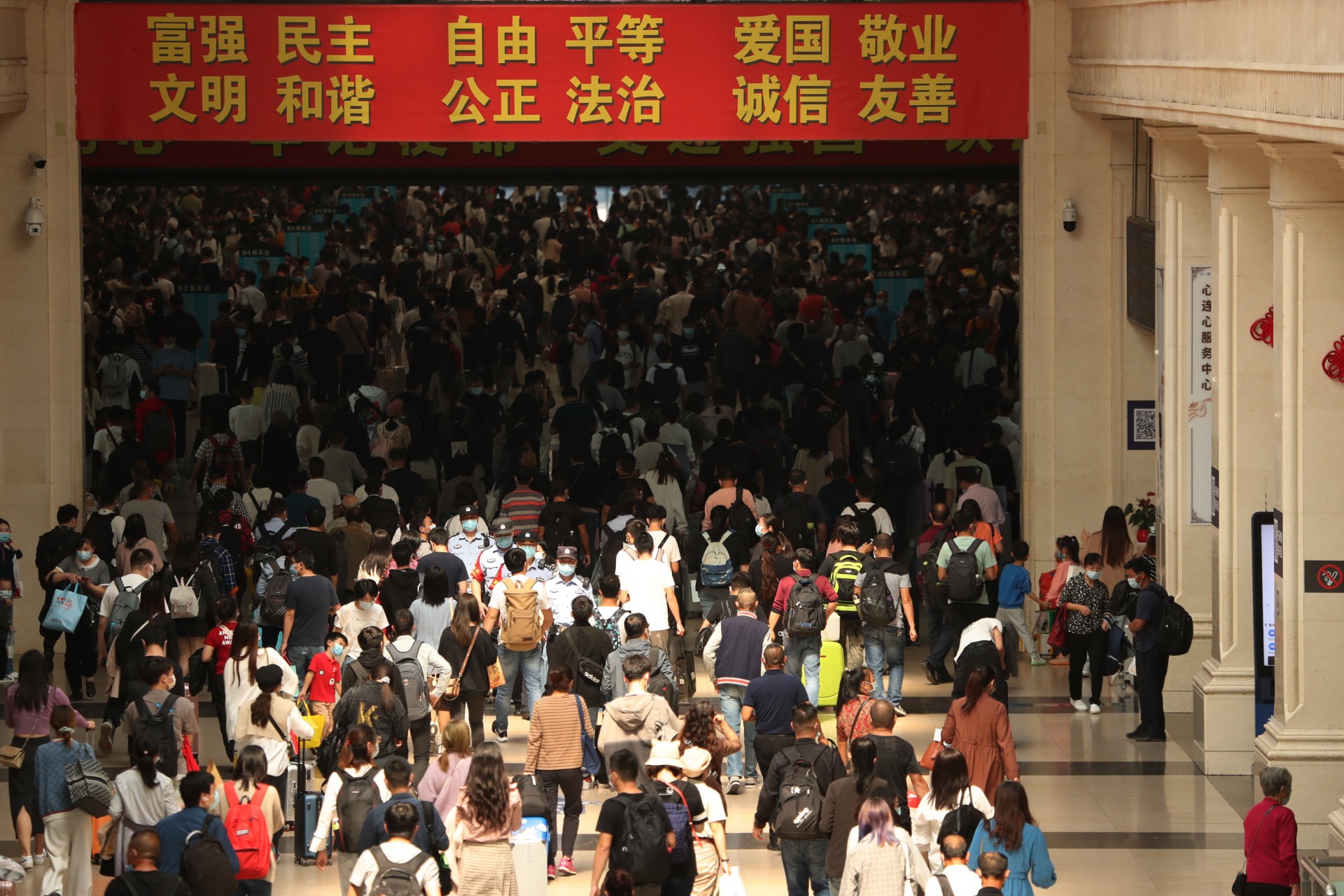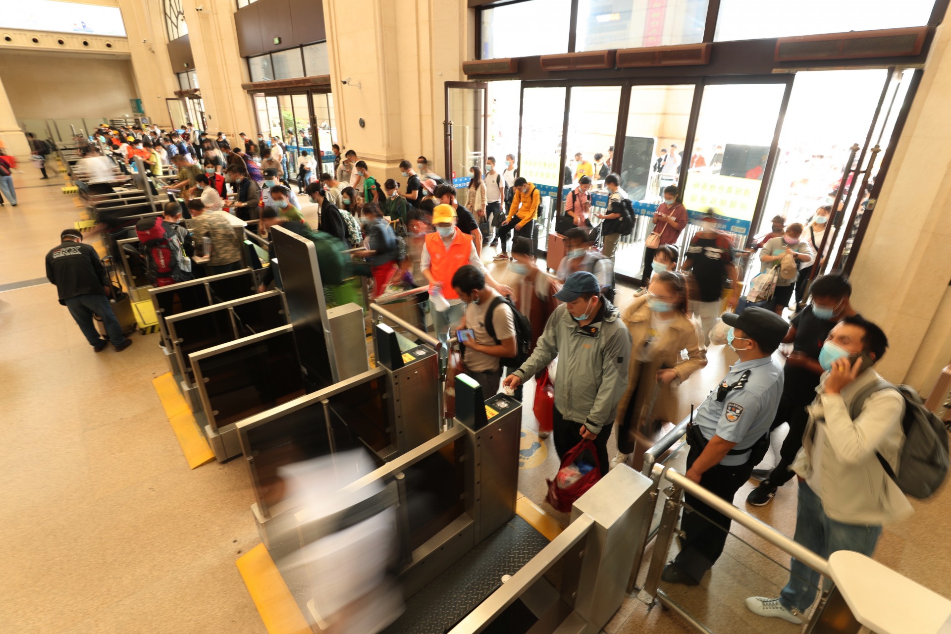 10月1日,湖北武汉。今年黄金周铁路运输期间,时值国庆节、中秋节双节叠加,武汉地区武汉、汉口、武昌等三大火车站迎来客流高峰,武汉铁路公安处民警坚守在岗位上,强化执勤、巡逻和治安面管控,火车站秩序井然。黄金周期间,中国铁路武汉局集团公司铁路客流日均在52.7万人次左右的高位运行,其中9月30日,武昌、汉口、武汉三大火车站当天预计共发送旅客28万人次,创疫情防控以来发送人数新高。