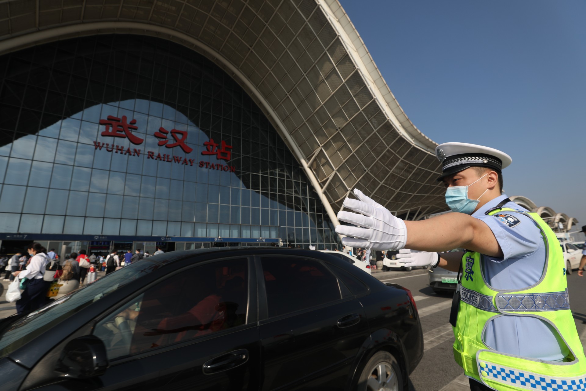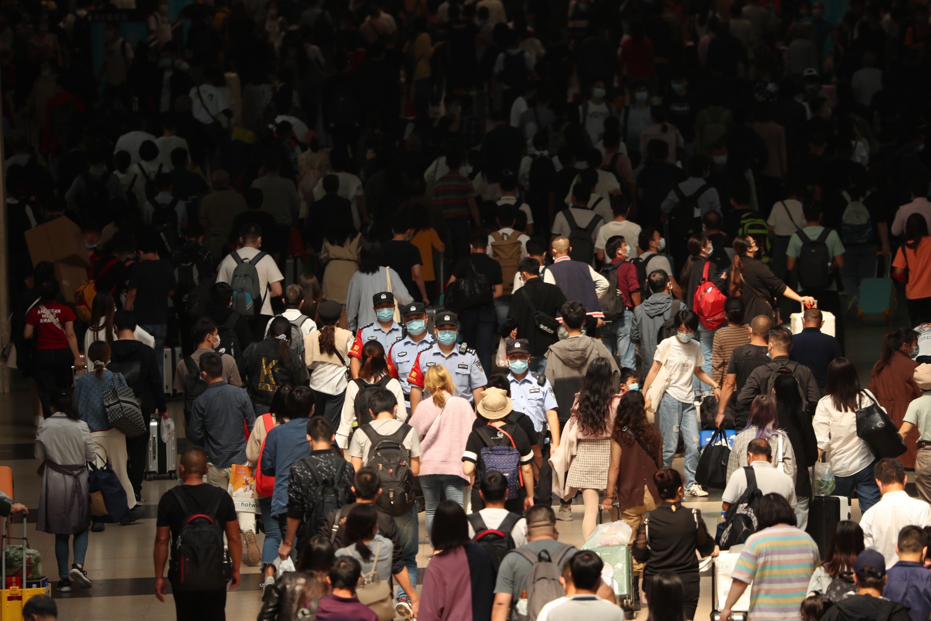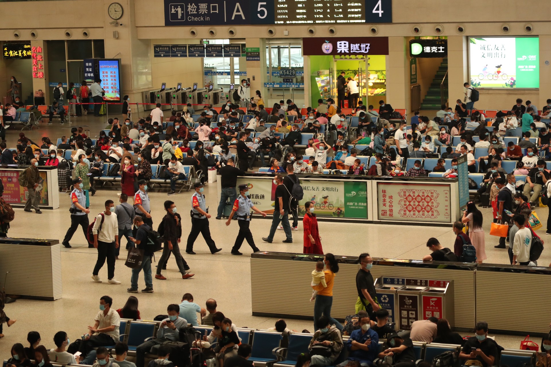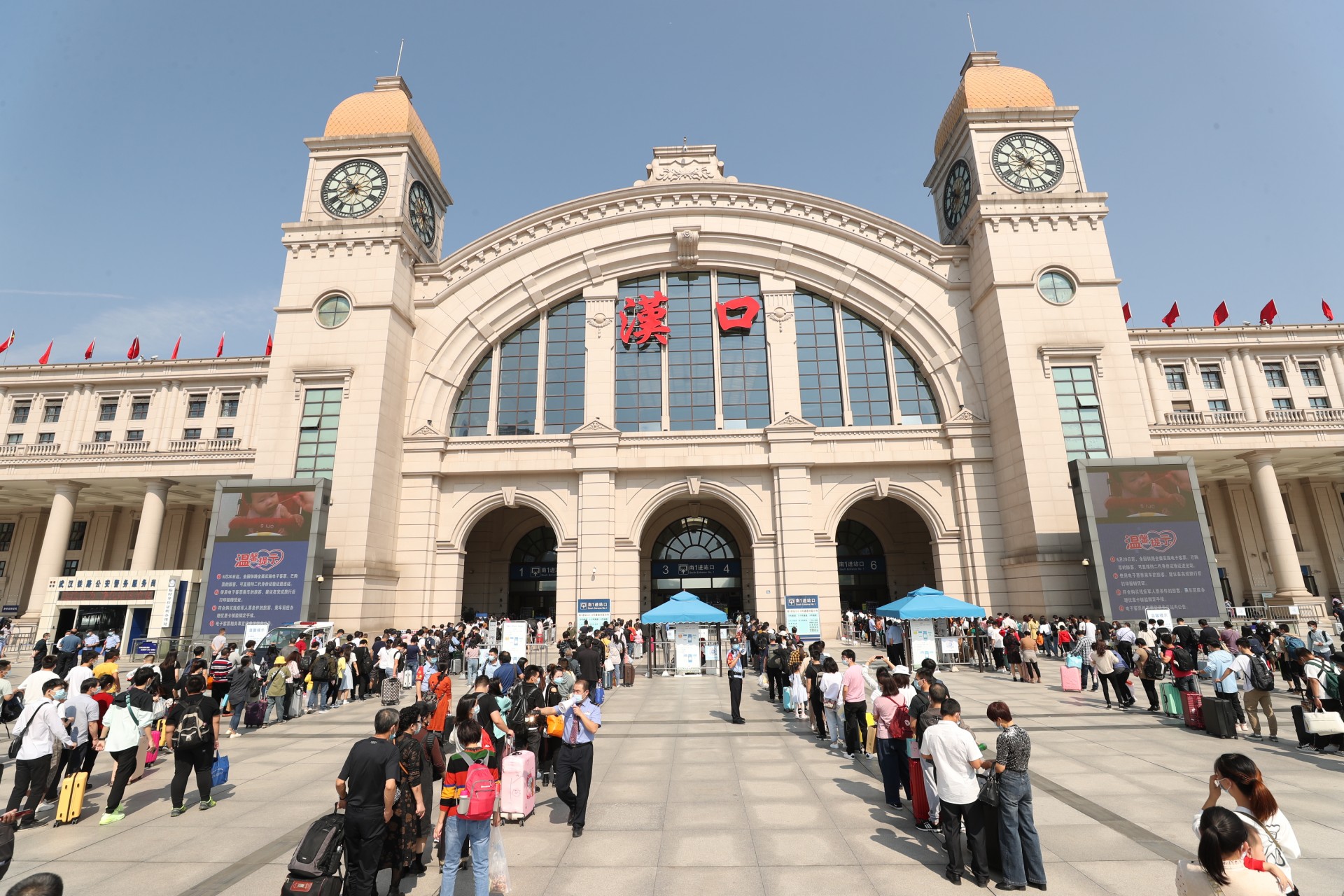 10月1日,湖北武汉。今年黄金周铁路运输期间,时值国庆节、中秋节双节叠加,武汉地区武汉、汉口、武昌等三大火车站迎来客流高峰,武汉铁路公安处民警坚守在岗位上,强化执勤、巡逻和治安面管控,火车站秩序井然。黄金周期间,中国铁路武汉局集团公司铁路客流日均在52.7万人次左右的高位运行,其中9月30日,武昌、汉口、武汉三大火车站当天预计共发送旅客28万人次,创疫情防控以来发送人数新高。