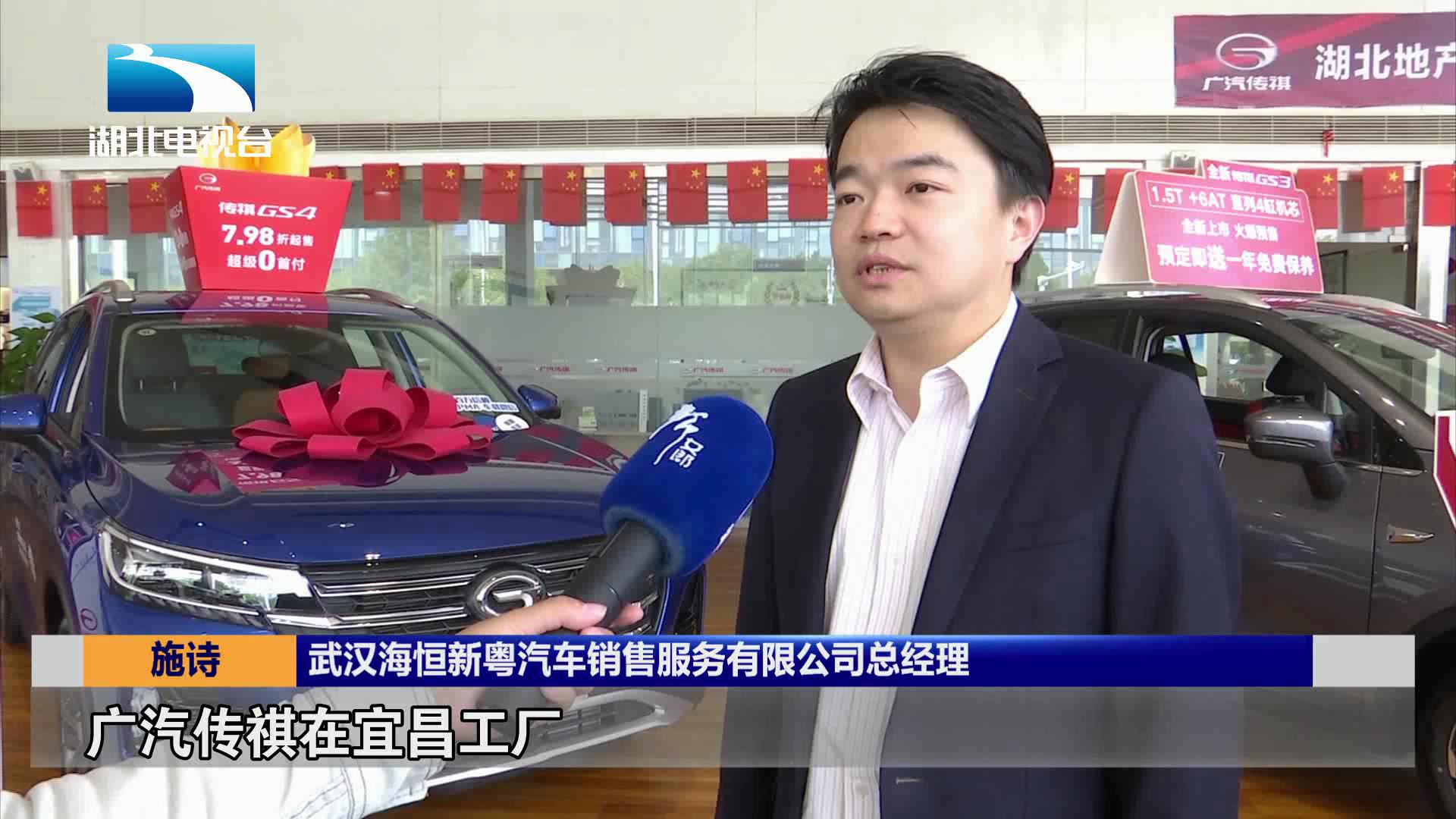 武汉海恒新粤汽车销售服务有限公司总经理 施诗:广汽传祺在宜昌工厂有一个年产20万的生产线,现在主要生产两款车型,一个是GA6 家用轿车,还有一个GS4,享受这次湖北的政策补贴的。在宜昌上牌跟武汉上牌的客户,主机厂也给予了每台3000块钱的补助。