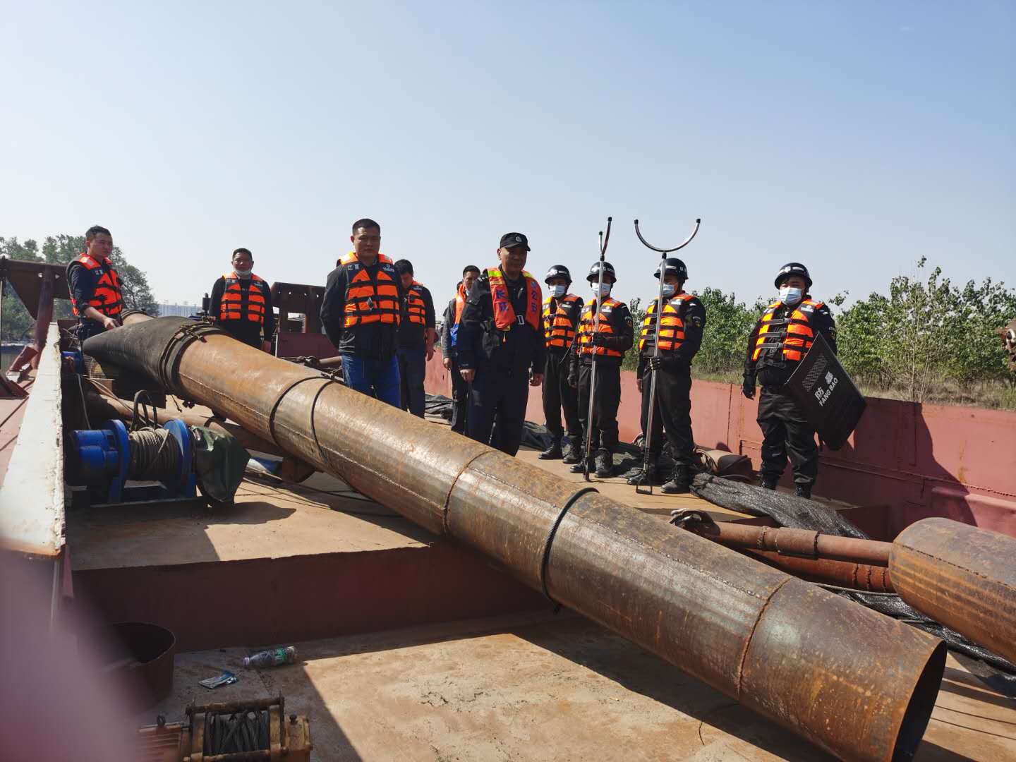 近期长江非法采砂又有抬头之势,加上长江水位变化较快,为保障辖区水域安全,全力维护辖区水域航道稳定,汉南派出所民警在与江夏区水政执法大队队员对长江江夏金口水域停靠船舶进行检查,旨在提早发现非法吸砂泵船、非法运砂船,从根本上遏制非法采矿的犯罪行为发生。在联合执法至金水河时,执法队员发现4艘船舶疑似吸砂泵船停靠在河内,遂登船进行检查。经过现场初查,发现停靠的4艘船舶均为“三无吸砂泵船”,采用可拆卸式吸砂管路,具备快速灵活机动,且具有高度的隐蔽性与迷惑性,长江江面可见度稍差,就难以发现非法采砂行为。